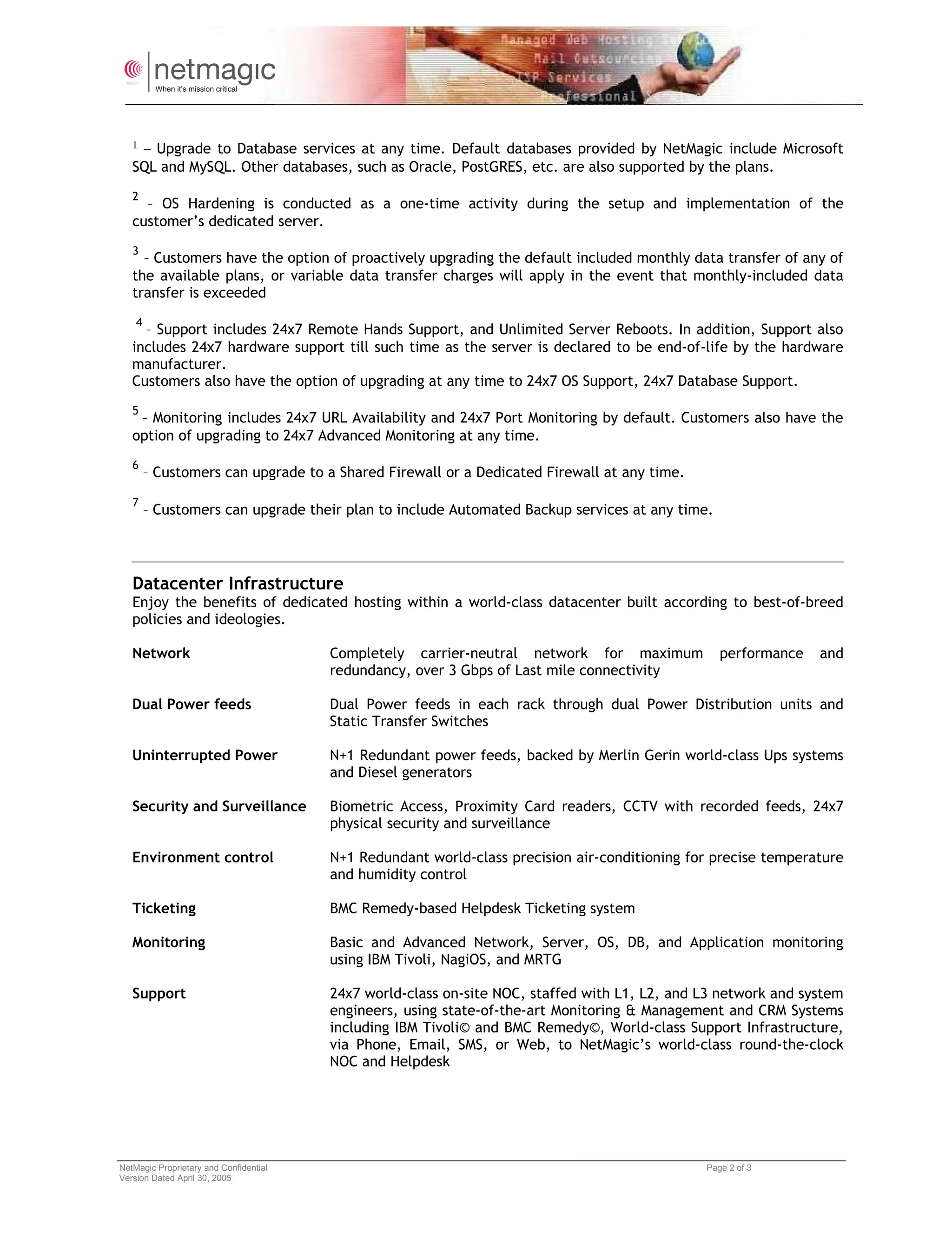 NetMagic offers dedicated hosting services for Windows and Linux servers with full control and flexibility. Their dedicated servers provide high performance and reliability with branded hardware, fast bandwidth, 24/7 monitoring and support, and high uptime SLAs. They offer four server configurations - BasicNet, ValueNet, PowerNet, and XtremeNet - with varying processor, RAM, storage, and other specifications. The servers are housed in world-class datacenters with redundant power and cooling, security, and 24/7 support. Customers can also upgrade servers and purchase additional services like firewalls, backups, and advanced monitoring.