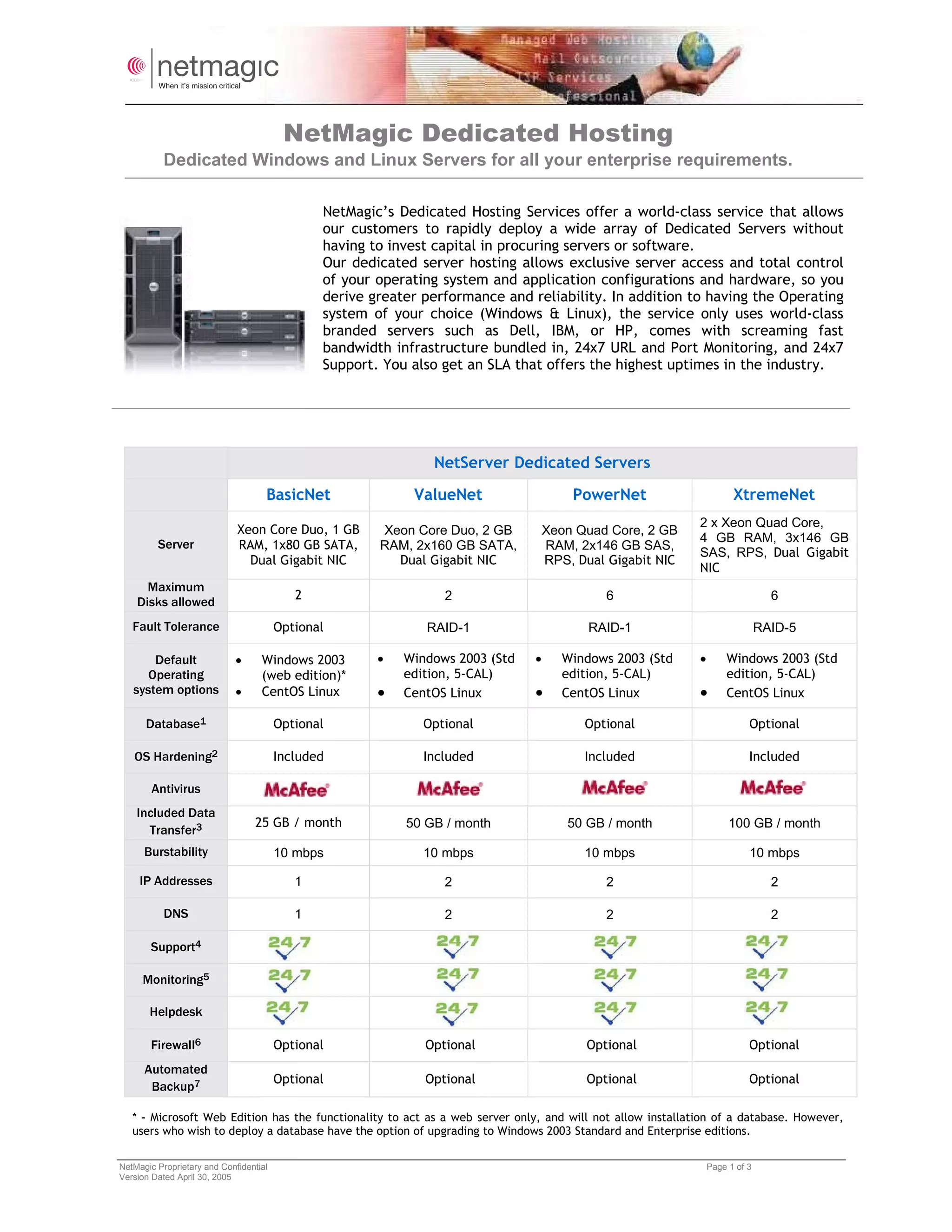 NetMagic offers dedicated hosting services for Windows and Linux servers with full control and flexibility. Their dedicated servers provide high performance and reliability with branded hardware, fast bandwidth, 24/7 monitoring and support, and high uptime SLAs. They offer four server configurations - BasicNet, ValueNet, PowerNet, and XtremeNet - with varying processor, RAM, storage, and other specifications. Colocated in world-class datacenters, the servers have redundant power and cooling and security. Customers can also upgrade services to add fault tolerance, firewalls, backups, and other options.