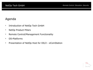 NetOp Remote Control software allows users to remotely access and manage computers running various operating systems. It provides features like remote control, file transfer, chat, and security options. NetOp is designed for scalability from small to large organizations and supports multiple communication protocols.