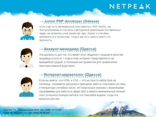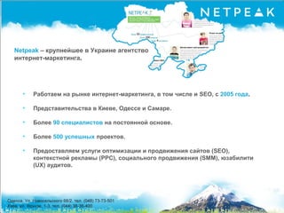 Netpeak – крупнейшее агентство интернет-маркетинга в Украине с более чем 90 специалистами и 500 успешными проектами. Компания предлагает услуги по SEO, PPC, SMM и UX-аудиту, стремясь эффективно продвигать бизнес клиентов в интернете. В Netpeak ищут амбициозных людей с позитивным мышлением, которые готовы адаптироваться и нацелены на результат.