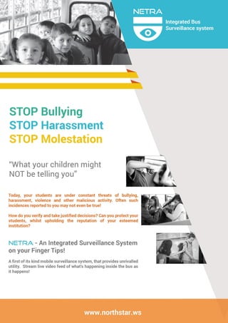 The document describes the Netra integrated bus surveillance system, designed to combat bullying, harassment, and violence in schools by providing live video feeds from buses. It emphasizes easy navigation, reliable support, and features like month-long video storage, remote monitoring, and customizable video parameters. Additionally, it highlights the system's protective capabilities for the institution's reputation and offers robust technical specifications.