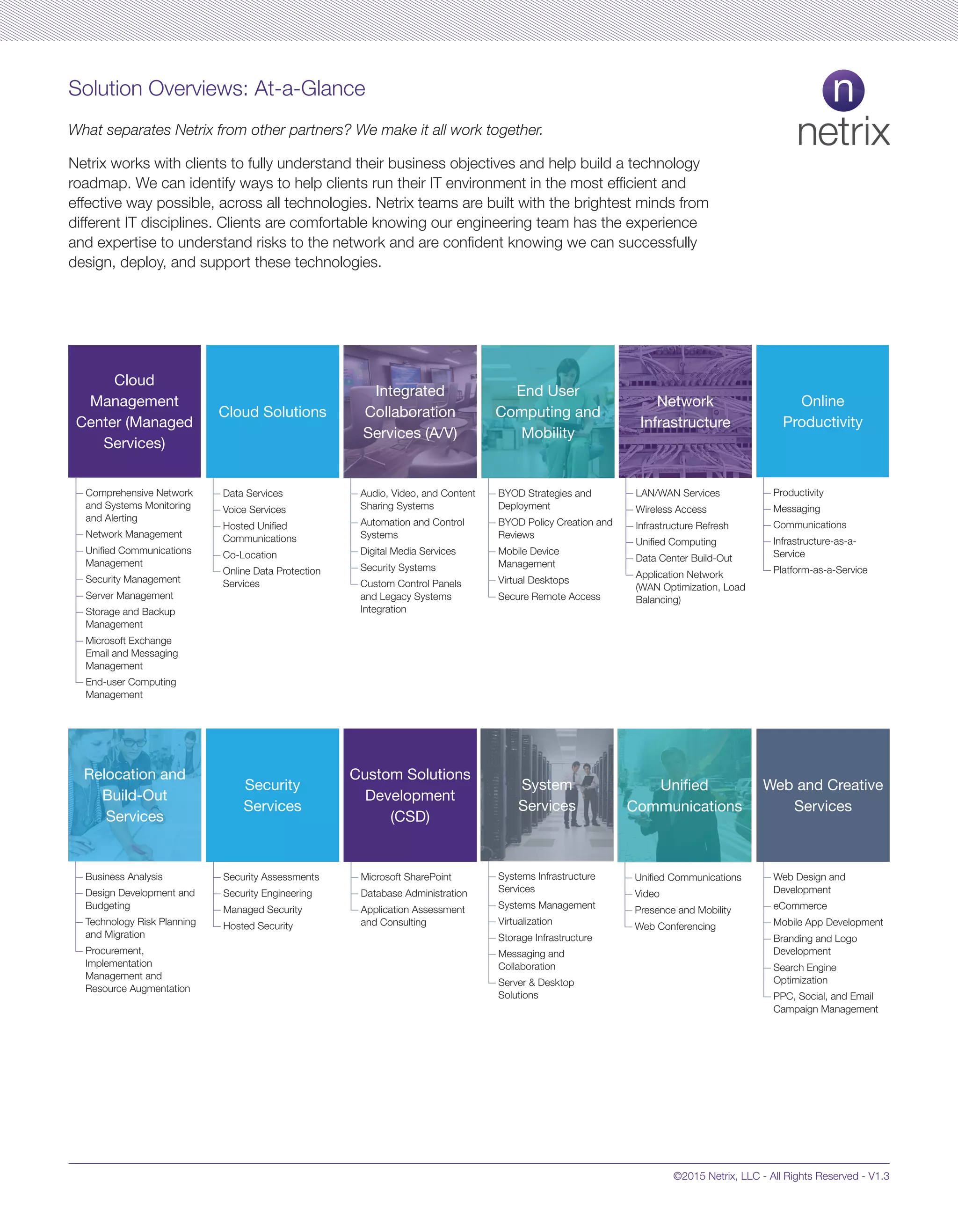Netrix works with clients to understand their business needs and develop a technology roadmap. They can identify ways to help clients run their IT environment efficiently and effectively across all technologies. Netrix has experts in different IT fields who can design, deploy, and support various technologies, managing risks to clients' networks.