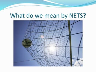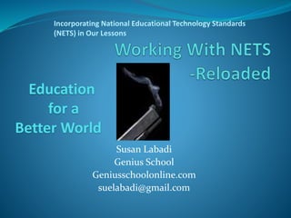 This document discusses incorporating National Educational Technology Standards (NETS) into lessons. It provides an overview of the NETS, which focus on student learning and creativity, digital-age learning experiences, modeling digital work, collaboration, and professional growth. Examples are given of digital tools and resources that can be used to engage students, such as Google Apps, podcasts, slideshows, and storytelling tools. The benefits of incorporating 21st century skills and technology into learning are discussed.