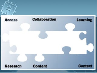 The document discusses technology trends that will impact libraries over the next decade. It identifies 23 trends that will be transformational, such as linked data, ebooks, mobile devices, and analytics. The author argues that libraries should focus on the user experience rather than technology itself and should position themselves as knowledge portals rather than just providers of collections and buildings. Libraries need to understand user behaviors and questions to develop the right service portfolio.