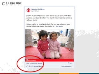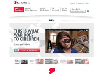 The document outlines a multi-channel digital strategy for the Save the Children 'Save: Syria' campaign, emphasizing the need to stand out, inspire action, and provoke conversation through various digital platforms. Key components include a dedicated website, social media initiatives, partnerships with influencers, and various content types aimed at raising awareness, advocacy, and fundraising. The campaign outcomes are yet to be determined, but it encourages innovative approaches and interconnectivity across channels.
