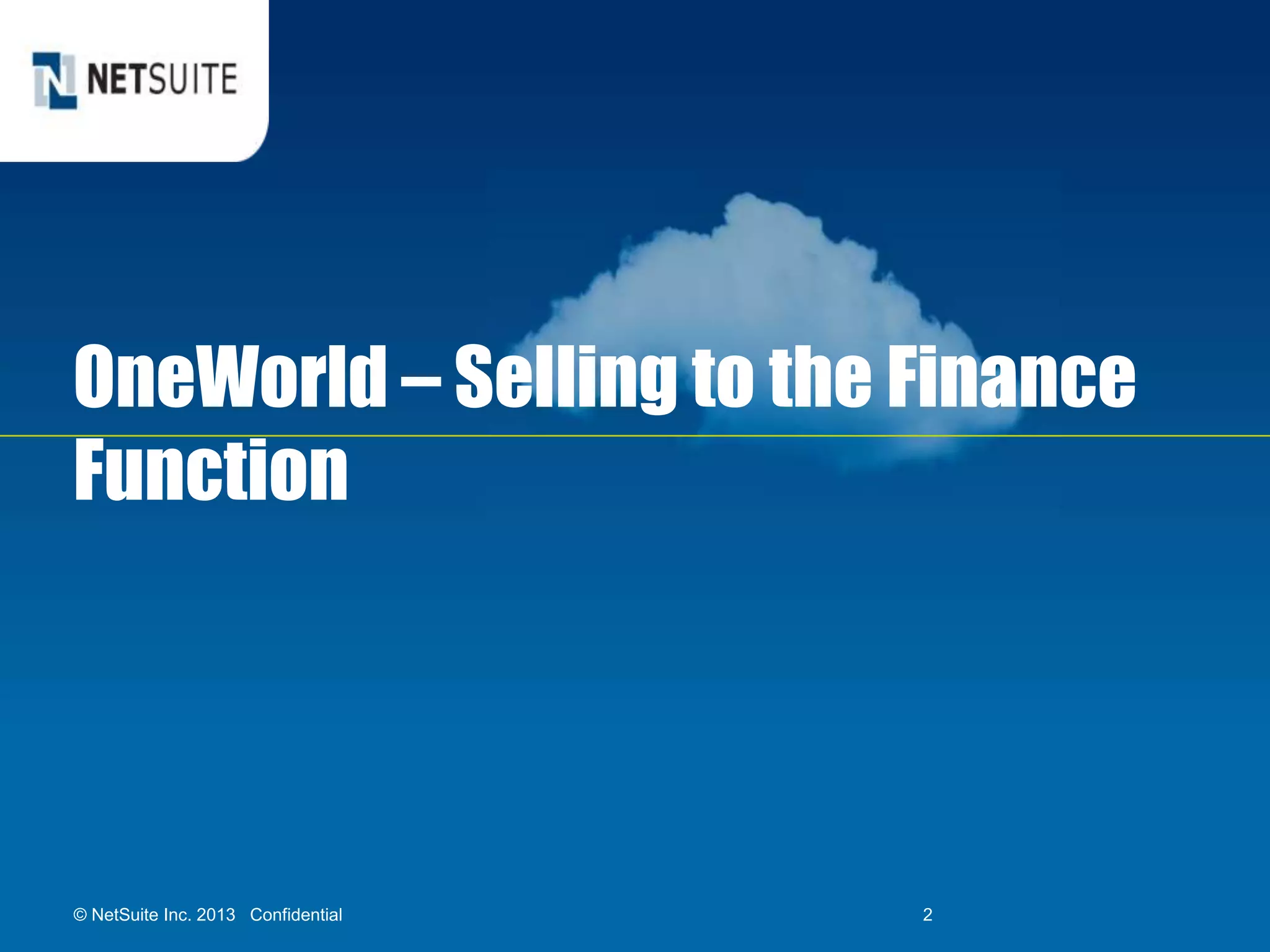 This document discusses engaging with finance and controllers to sell NetSuite's ERP solution. It begins with an overview of NetSuite's strategy of moving upmarket and engaging the finance function. It then discusses understanding the unique role of controllers and presenting NetSuite in a way that addresses controllers' needs around internal controls, closing processes, reporting, audit functionality, and global compliance. One section provides a case study of how NetSuite helped dental implant company ClearChoice improve processes, gain transparency, and complete a private equity merger. The document provides tools and strategies for salespeople to effectively engage with controllers.
