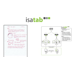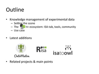 The document discusses knowledge management of experimental data through the ISA ecosystem. It describes the ISA-tab format and software suite that allows annotation and curation of experimental metadata. As a use case, it analyzes a dataset on metabolite profiling from a study of fatty acid amide hydrolase knockout mice. The ISA tools can represent investigations and assays, convert data to standardized formats, and facilitate sharing and analysis of experimental data.