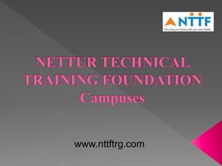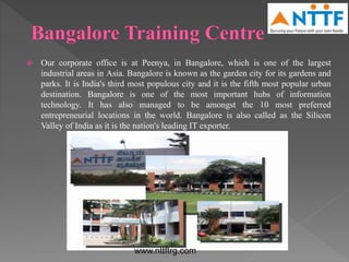 Bangalore, known as the 'Silicon Valley of India', is a major hub for information technology and entrepreneurship, housing various training centers. The NTTF, established in 1959, operates multiple centers across India, including Vellore, Thalassery, Hyderabad, and Pantnagar, offering advanced technical training with modern facilities. Partnerships with organizations like Tata Steel and Ashok Leyland enhance practical training opportunities for students.