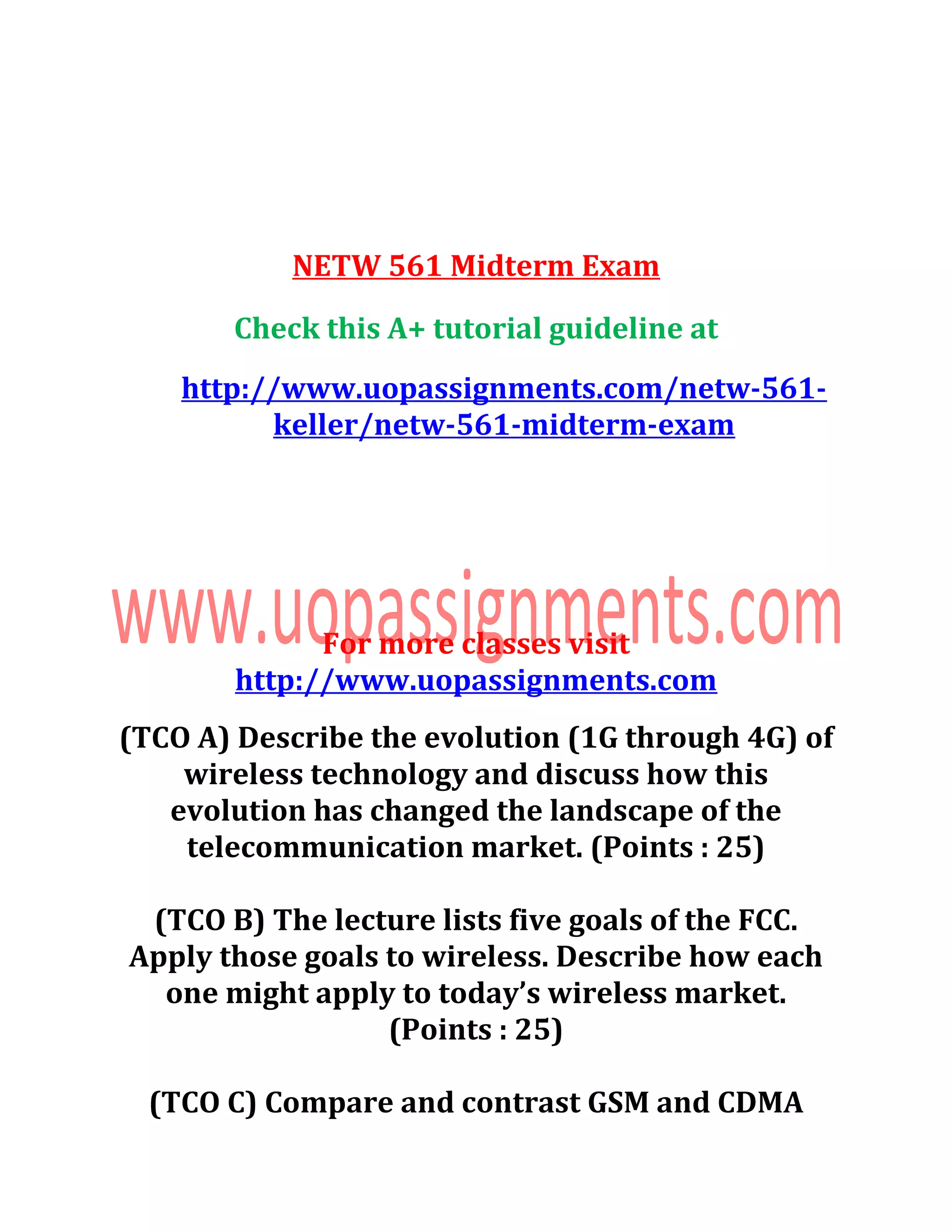 The document outlines the guidelines for the netw 561 midterm exam, covering topics such as the evolution of wireless technology from 1G to 4G, FCC goals as they pertain to wireless, a comparison of GSM and CDMA technologies, and the applications of various mobile communication technologies like SMS and GPRS. Each topic is assigned specific point values, indicating their importance in the exam. The resources provided include links to further educational material related to the course.
