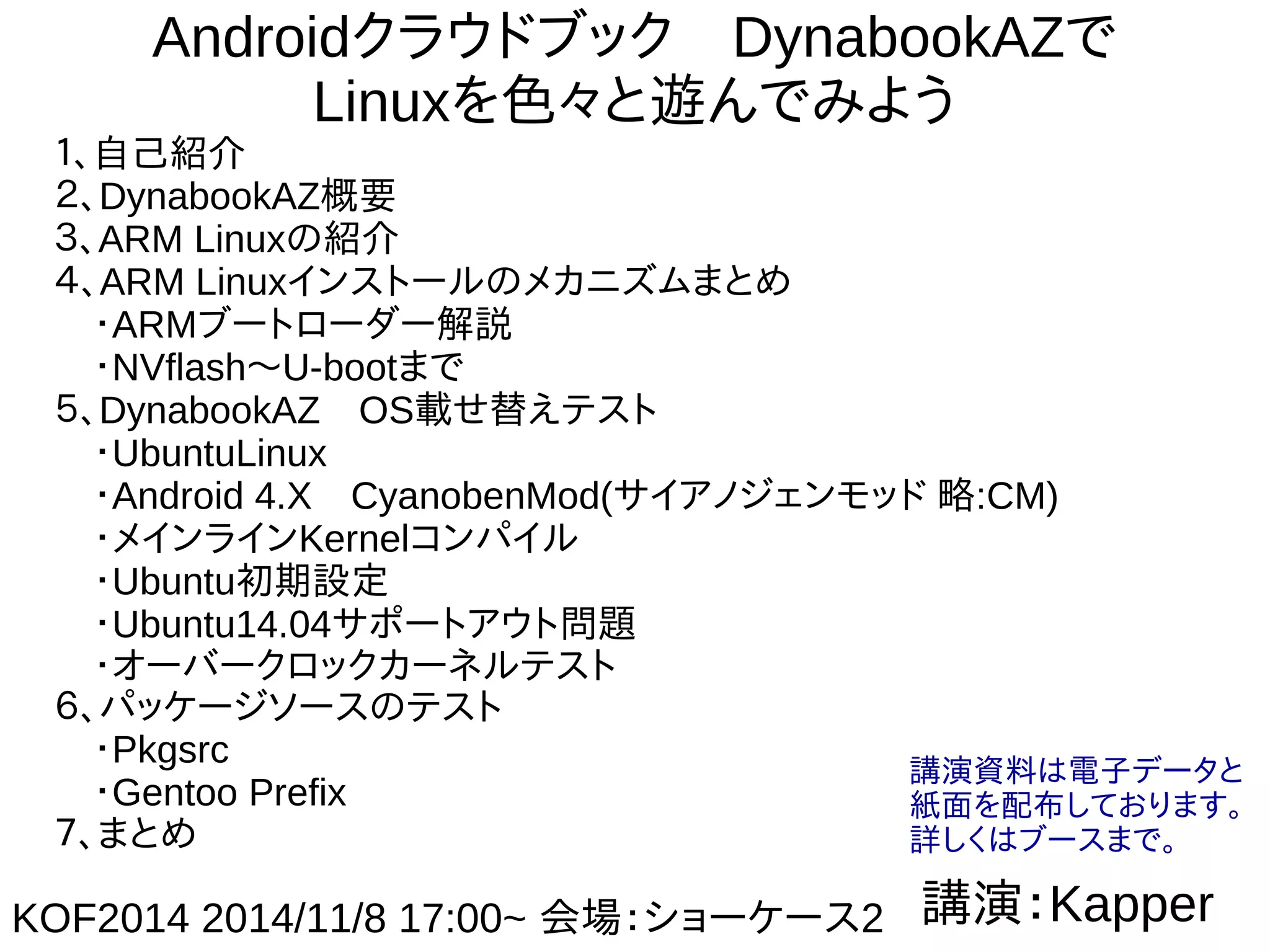 1.0GHz(旧CoreDuo1.2GHz相当) 理論上では1.8GHzまでオーバークロック可能。実用1.5GHz相当で 旧Core2Duo1.2GHz相当まで高速化が可能です。 ● 2010年10月のUbuntu開発サミットで CanonicalのCEOマーク・シャトルワース氏 がUbuntuを入れたDynabook AZの べた褒めしていました。 思えばこれが全ての始まりかもしれません。 ● Ubuntuの公式サポートとAndroid CyanogenMod移植に伴い全世界的に サポートが続けられ生き残っています。 ● Marc Dietrich氏によるmarvin24 Kernel ポートが開発され様々なディストリに移植 ● Linux Kernel3.15.0-rc3から メインライン採用により移植が不要と なりました。 DynabookAZ