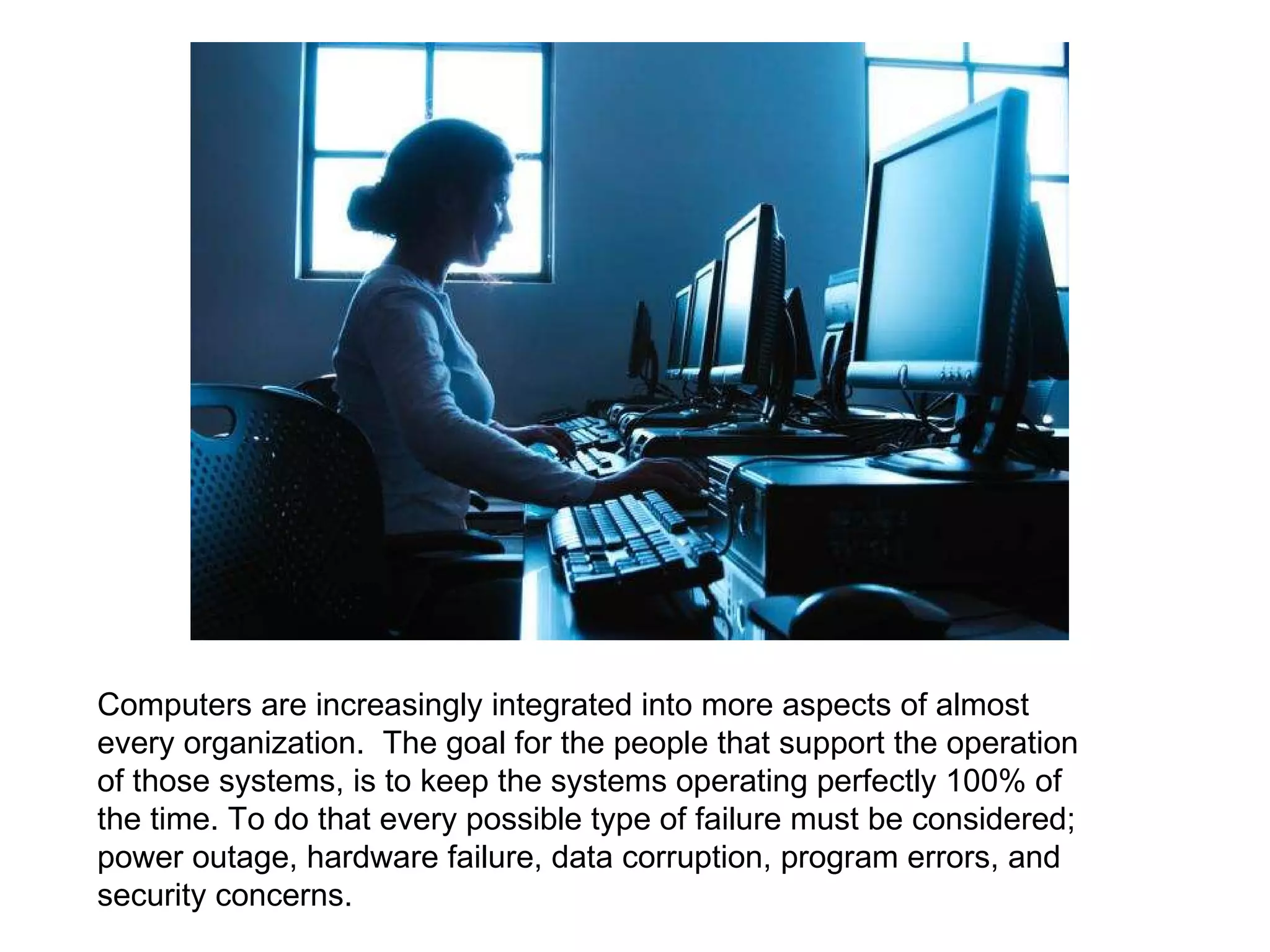 The document discusses the role and responsibilities of a network administrator. It describes how computers are now integrated into many organizational systems and must operate reliably to support functions like phone systems, heating, and more. As a network administrator, key responsibilities include installing and upgrading software and hardware, troubleshooting issues, monitoring systems for security and performance, and ensuring critical infrastructure like servers and backups are functioning properly. Attention to detail, ability to think ahead and consider many scenarios, and strong documentation skills are important for the job.