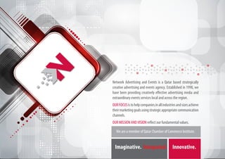 Network Advertising and Events is a Qatar-based creative agency established in 1998, specializing in advertising media and event management services across the region. The agency focuses on delivering effective marketing solutions tailored to various industries, emphasizing the balance between strategy and creativity. Their team collaborates with trusted partners to ensure timely project delivery and client satisfaction, fostering long-term relationships evident from repeat business.