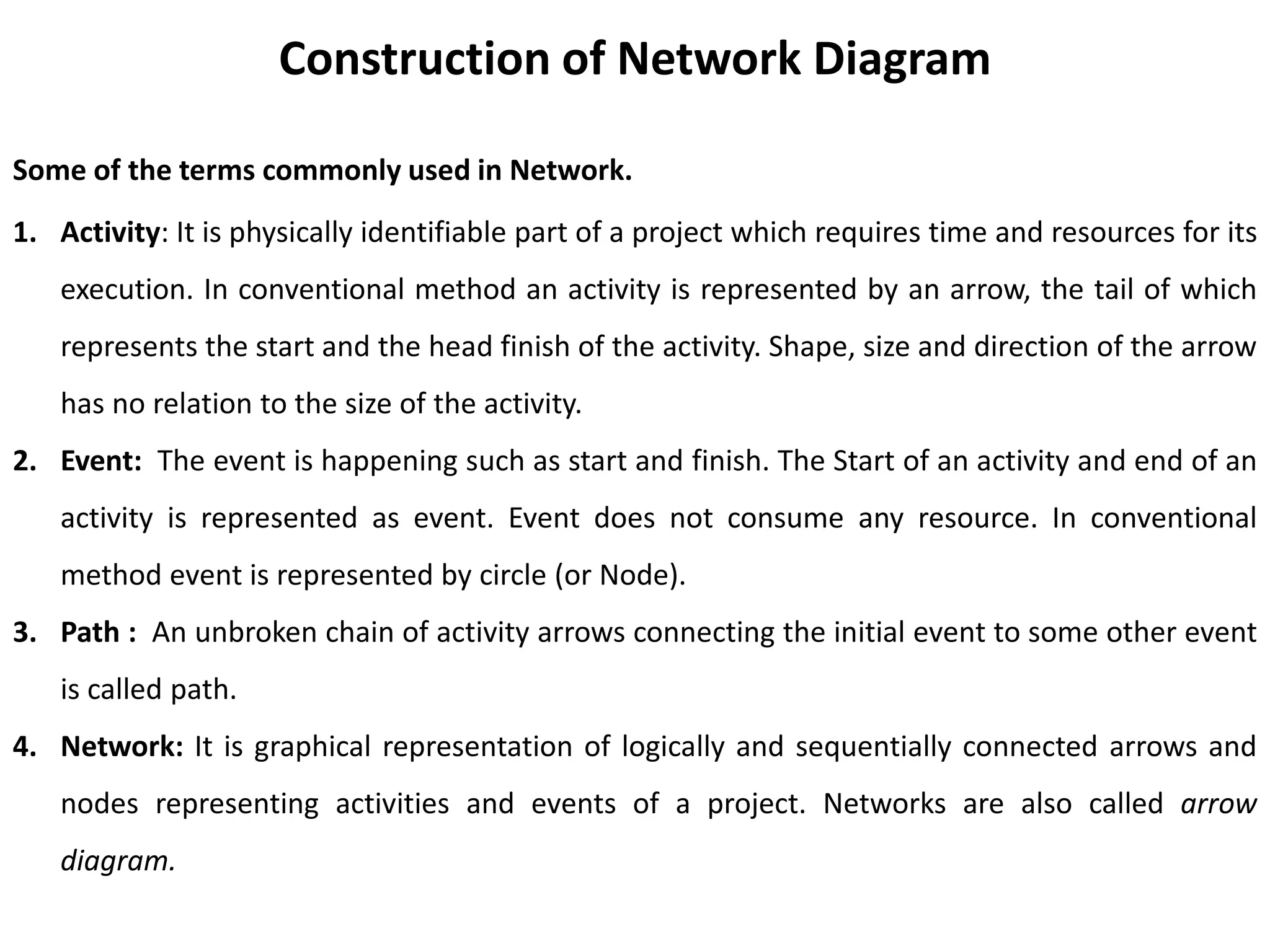 The document discusses the construction of network diagrams in operations research, explaining key terms such as activities, events, paths, and networks. It presents two methods for constructing network diagrams: Activity-on-Arrow (AOA) and Activity-on-Node (AON), along with their respective benefits and limitations. Additionally, it highlights Fulkerson's rule for event numbering and compares the applications of PERT and CPM in project management.