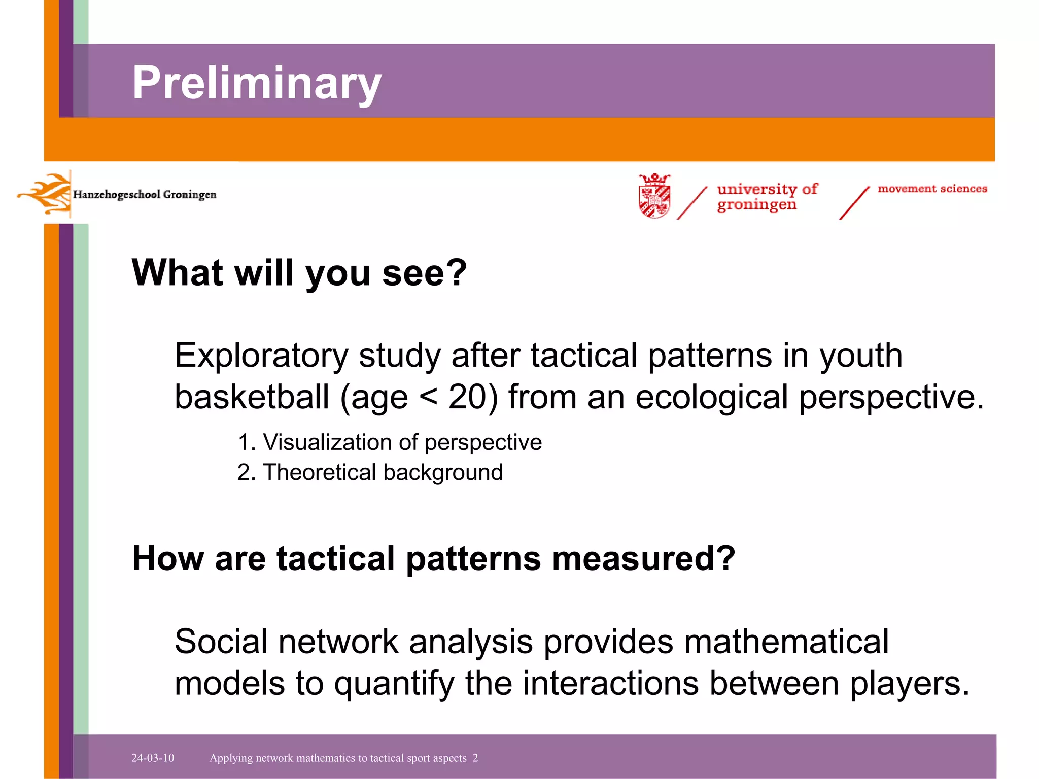 The document explores the application of network mathematics to analyze tactical patterns in youth basketball, particularly focusing on the interactions among players during offensive phases. It utilizes social network analysis to quantify these interactions, emphasizing the importance of understanding player roles and their betweenness in gameplay. The study aims to enhance performance indicators and tactical decision-making through a theoretical and ecological framework.