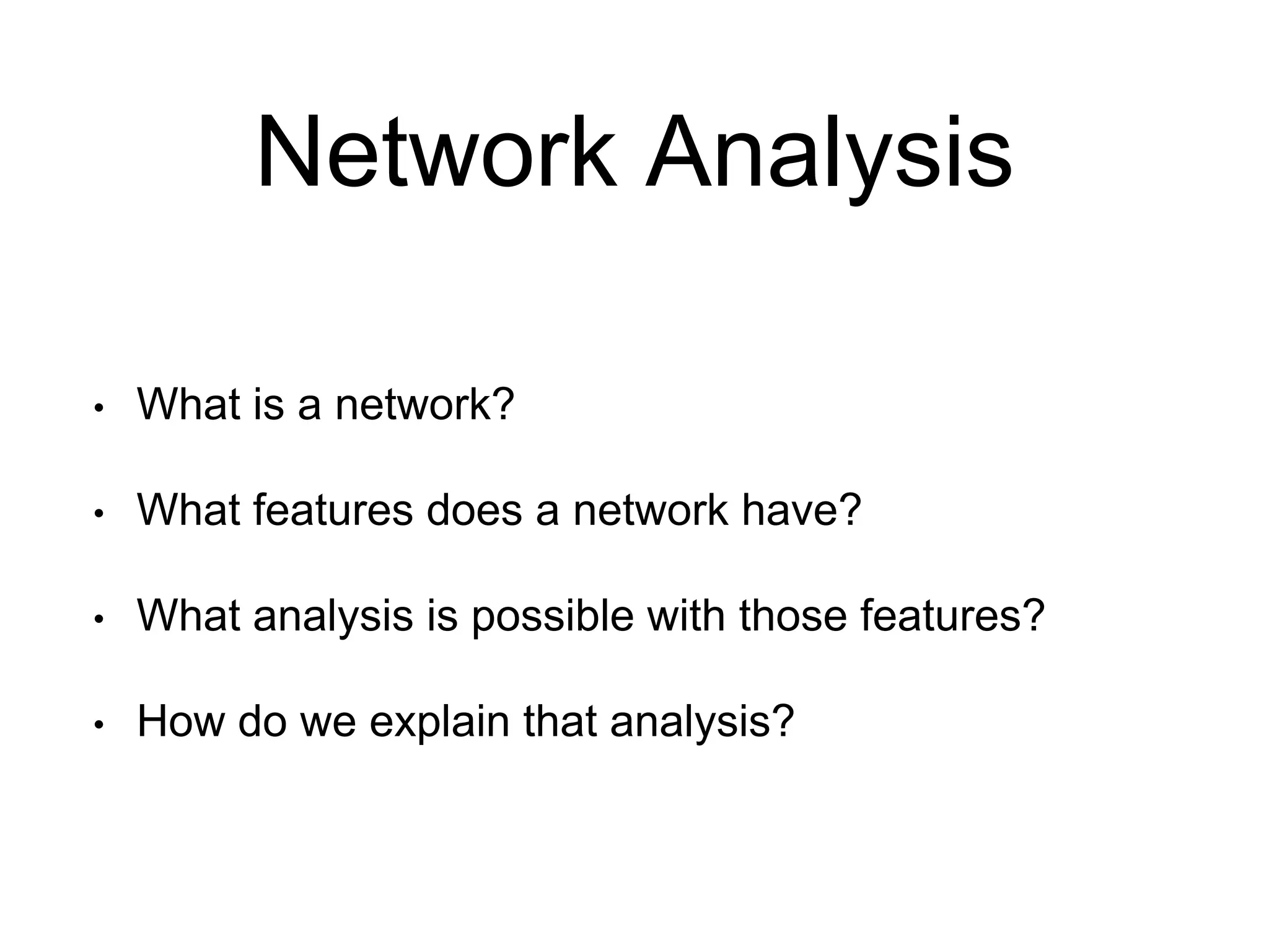 This document discusses network analysis. It defines what a network is and describes common network features like nodes, edges, and centrality measures. It also covers network representations, using the NetworkX library to analyze networks, detecting communities within networks, and analyzing how information spreads through networks. A variety of network analysis tools are also listed.