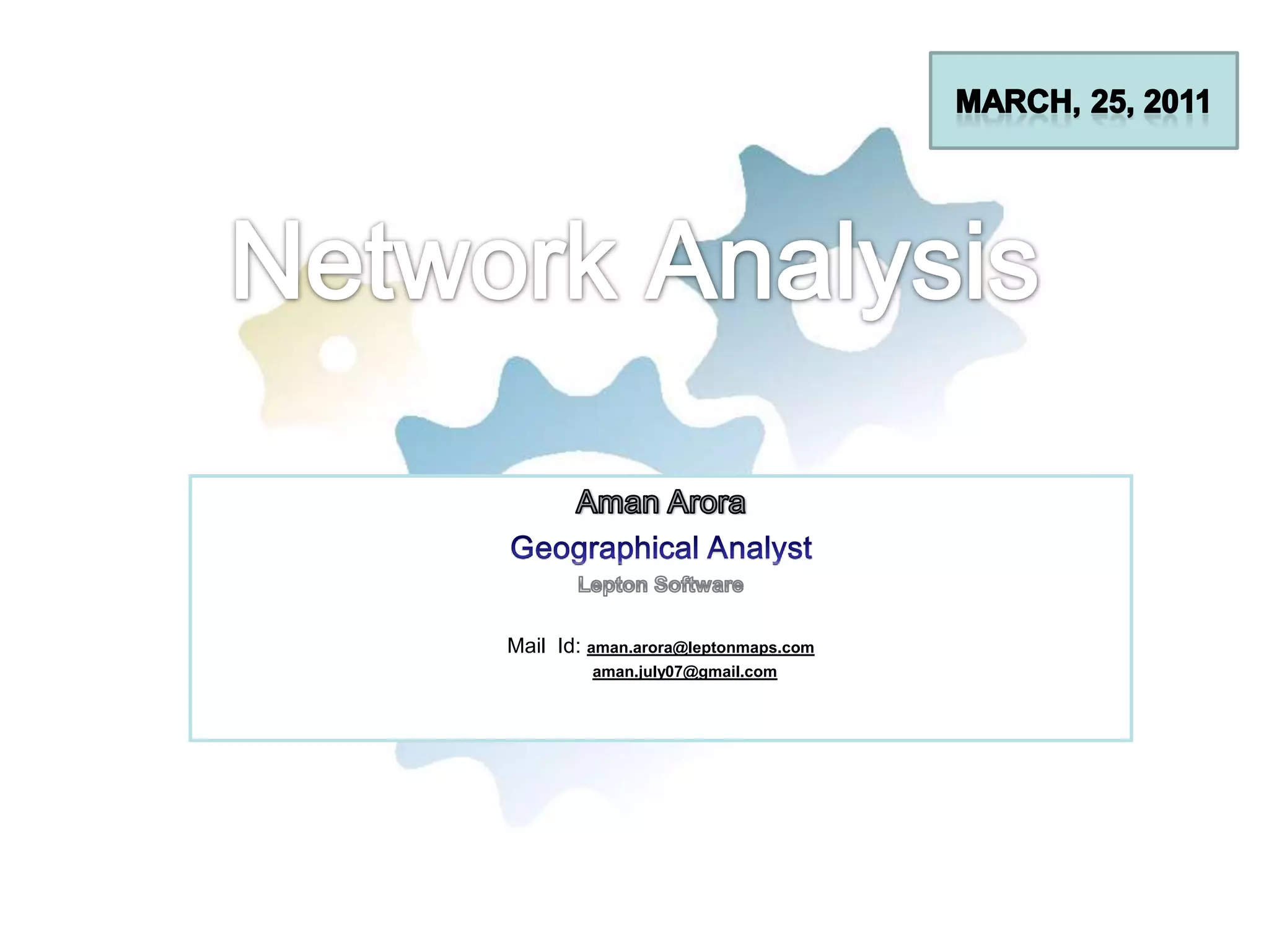 This document discusses network analysis and its various types and applications. It provides an overview of network analysis, describes how ArcGIS Network Analyst can be used to perform different network analysis tasks like finding routes, service areas, closest facilities, and vehicle routing. It also explains key concepts in network analysis like network datasets, impedance, and location-allocation analysis.