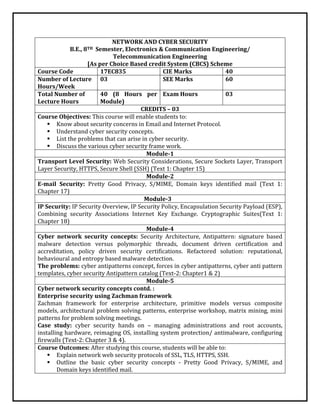 The document outlines a course on Network and Cyber Security designed for 8th-semester Electronics and Communication Engineering students at B.G.S Institute of Technology. It covers various security protocols such as SSL and TLS, email security, IP security, and enterprise security frameworks, along with learning outcomes aimed at understanding and applying cyber security concepts. Key modules address security architectures, web security threats, and hands-on case studies related to cyber security management and implementation.