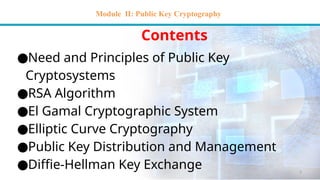 The document provides an overview of public key cryptography, detailing its principles, applications, and the RSA algorithm. It discusses key generation, encryption and decryption processes, as well as the requirements for secure public key systems, highlighting the importance of generating secure keys and addressing potential vulnerabilities. The RSA algorithm is presented as a significant method for public key encryption, illustrating its operational mechanisms and security considerations.