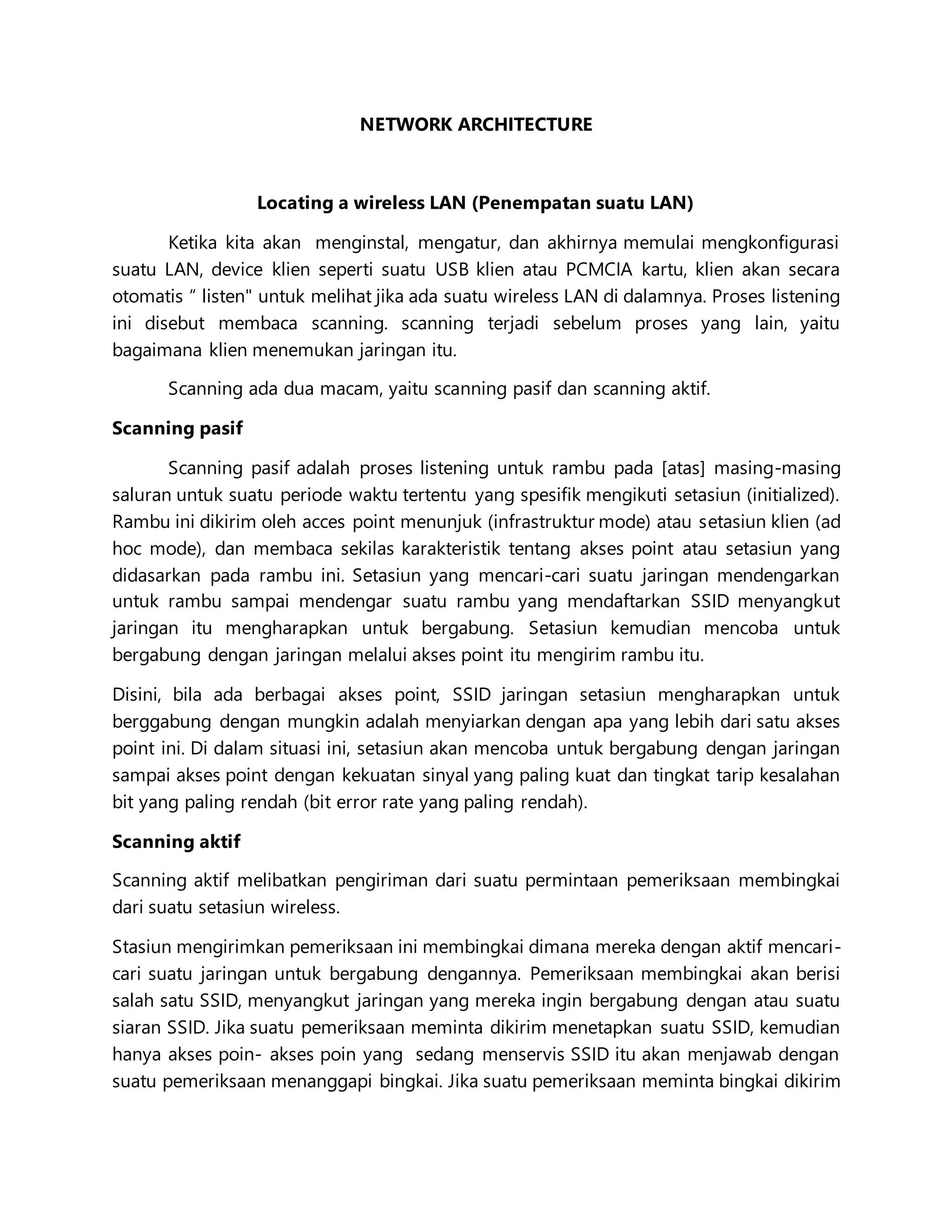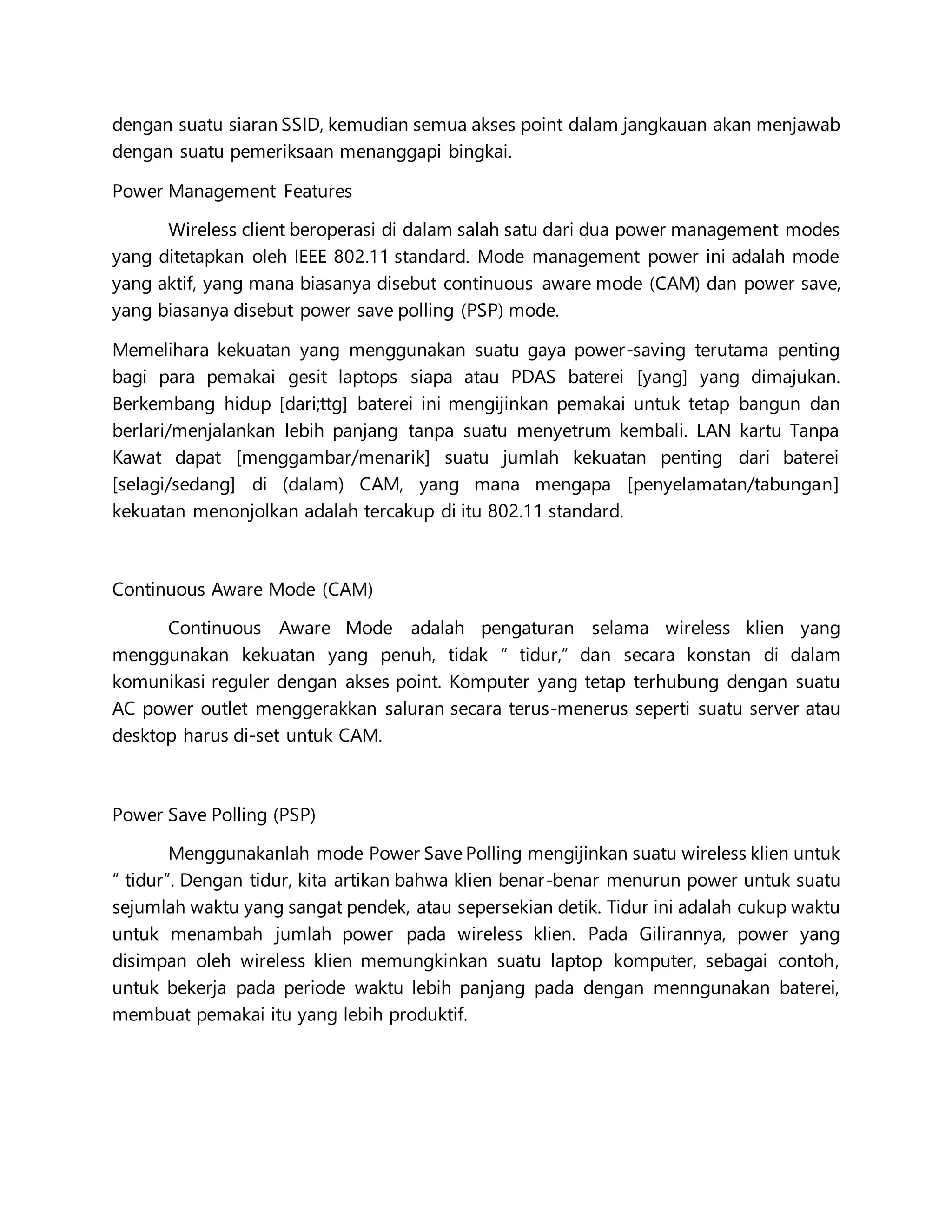 Scanning adalah proses mencari jaringan nirkabel dengan dua metode: pasif dengan mendengarkan sinyal akses poin, dan aktif dengan mengirim permintaan untuk menemukan jaringan dengan SSID tertentu. Mode manajemen daya ada dua: mode terus sadar yang menggunakan daya penuh, dan mode penghematan daya yang mengijinkan klient tidur sebentar untuk menghemat daya baterai dan memperpanjang waktu kerja.