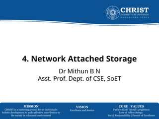 The document discusses Network-Attached Storage (NAS), highlighting its role in providing a high-performance, dedicated file-serving system that consolidates storage and enhances efficiency in data sharing. It outlines the components and implementations of NAS, such as integrated and gateway solutions, and details the protocols (e.g., NFS and CIFS) used for file sharing and management. It also addresses factors affecting NAS performance, including network configurations and optimizations to improve latency and throughput.