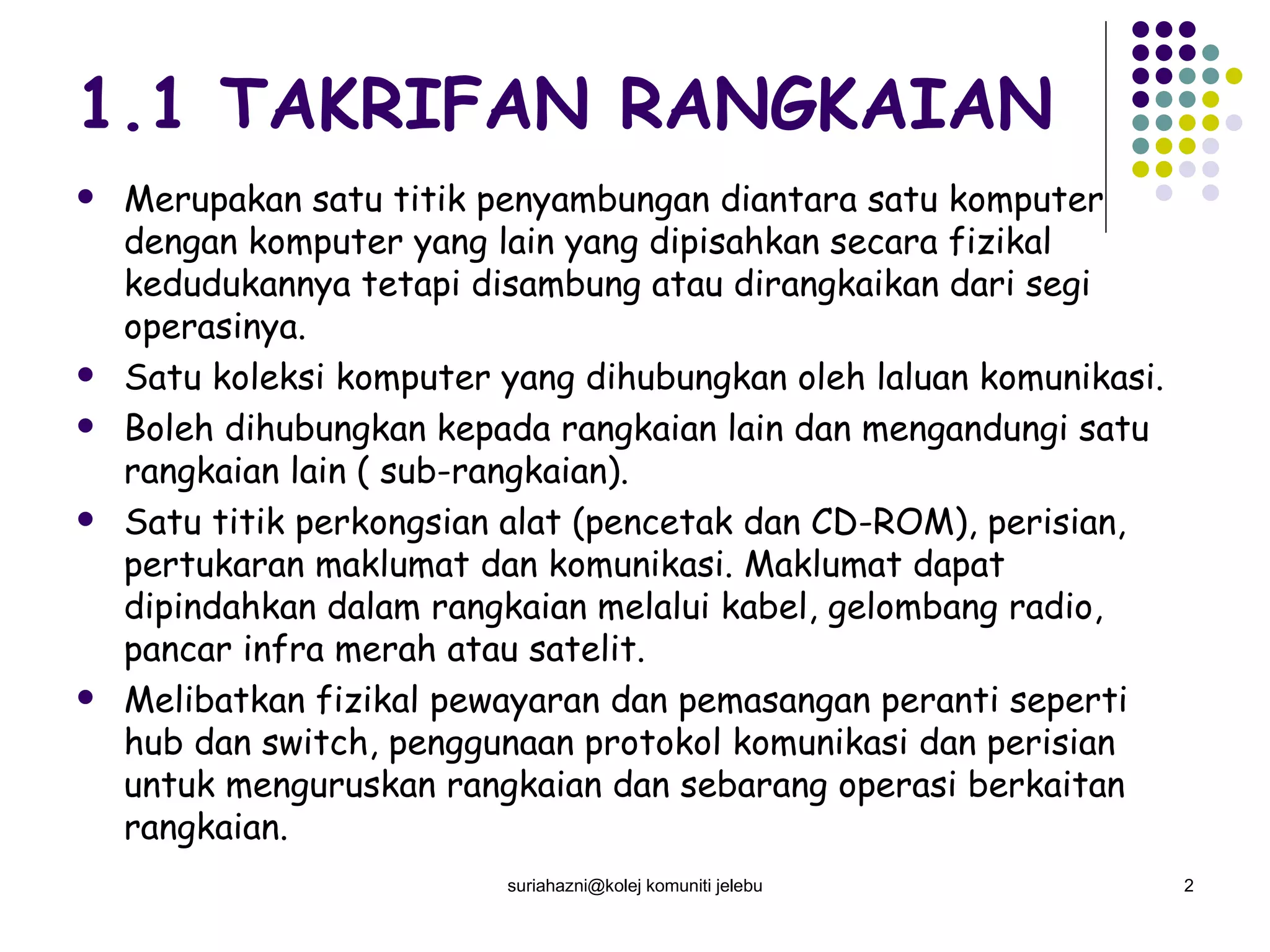 Dokumen ini membincangkan asas rangkaian komputer, termasuk definisi, kelebihan, dan ciri-ciri kelas rangkaian seperti LAN, WAN, dan MAN. Rangkaian menghubungkan komputer untuk berkongsi sumber, memindahkan data, dan meningkatkan kecekapan. Ia juga menerangkan topologi rangkaian yang lazim digunakan dan fungsi pelayan fail dalam rangkaian.