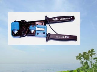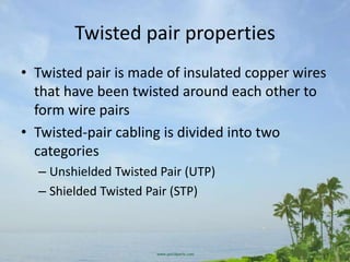 UTP cable is made of twisted copper wire pairs within a plastic sheath. It comes in categories like Cat3, Cat5, and Cat5e. STP cable includes a protective foil wrapping. RJ-45 connectors are used to terminate UTP cable. The installation process involves stripping cable, arranging wire pairs, crimping the RJ-45 connector, and testing the cable. Solid core cable is for fixed runs while stranded core is more flexible for patch cables. Proper tooling and technique are required to make reliable network cables.