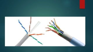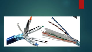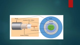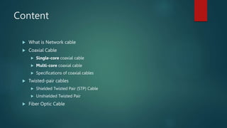 Network cabling includes coaxial cable, twisted-pair cable, and fiber optic cable. Coaxial cable uses a central conductor surrounded by insulation and a braided shield, and can be single-core or multi-core. Twisted-pair cable consists of multiple insulated copper wire pairs that can be shielded (STP) or unshielded (UTP). Fiber optic cable transmits data using light pulses through glass cores and is less susceptible to interference over longer distances than other cable types.