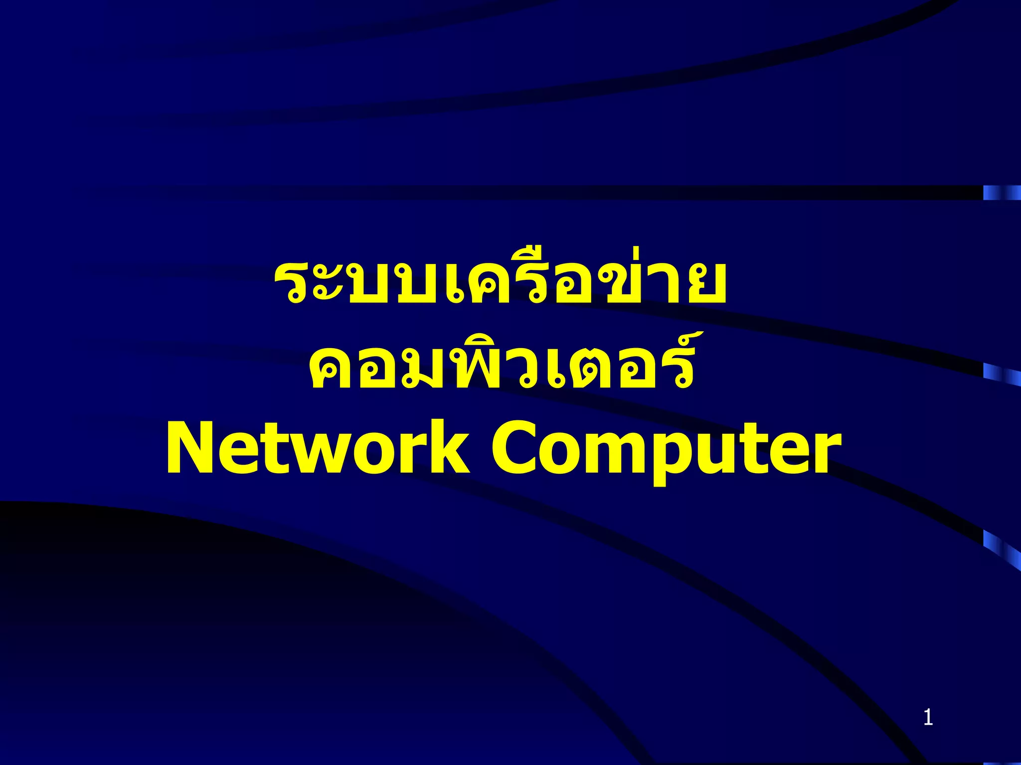 Network Computer 1. 2. 3. Communication การสื่อสารข้อมูลเป็นการรับ - ส่งข้อมูลอิเล็กทรอนิกส์จากต้นทางไปยังปลายทาง ผ่านอุปกรณ์เชื่อมโยง ( Channel ) ซึ่งอาจเป็นสายเคเบิลหรืออุปกรณ์ไร้สาย Sending device Communication Device Communication Device Receiving device Communication Channel 4. จดหมายอิเลคทรอนิกส์ ( E-Mail) – การสื่อสารกันโดยใช้ E-Mail บริการฝากข้อความ (Voice Mail) -- การฝากข้อความเมื่อผู้ที่ต้องการติดต่อไม่อยู่ บริการ แฟกส์ ( Facsimile) บริการโทรศัพท์ ( Smart Phones) -- ใช้โทรศัพท์ผ่านทางเครือข่าย Instant Messaging – การส่งข้อความ / เสียงออนไลน์ไปยังผู้รับที่อยู่ห่างไกล Telecommuting – วิธีการทำงานจากทางไกล โดยที่พนง . ไม่ต้องเข้าไปประจำที่สำนักงาน เช่น การติดต่อเครื่องคอมพิวเตอร์ในสำนักงานจากที่บ้านผ่านทางโมเด็ม การใช้งานในระบบเครือข่าย Use of Communication 5. การใช้งานในระบบเครือข่าย Use of Communication Video Conferencing – การพูดคุยกันผ่านทางวีดีโอ สามารถเห็นภาพ ได้ยิน และพูดโต้ตอบกันได้ทันที Groupware – เป็น S/W ที่ใช้ร่วมกันหลายคน หรือไว้ติดต่อสื่อสารกัน Global Positioning System -- การหาตำแหน่งที่ตั้งของวัตถุที่ต้องการ Bulletin Board System -- กระดานข่าวที่ใช้อ่านข่าวผ่านระบบเครือข่าย The Internet ( WWW, E-Commerce, Telephony) 6. 7. LAN (Local Area Network) เป็นการนำคอมพิวเตอร์มาเชื่อมต่อกัน ในระยะใกล้ๆ เช่น ภายในห้องเดียวกัน ชั้นเดียวกัน หรือ อาคารเดียวกัน 8. MAN (Metropolitan Area Network) เป็นการนำคอมพิวเตอร์มาเชื่อมต่อกัน ซึ่งอาจจะเป็นการนำเอา LAN มาเชื่อมต่อกันในระยะกลาง ครอบคลุมพื้นที่ ในอำเภอ หรือในจังหวัดเดียวกัน MAN 9. Wan (Wide Area Network) เป็นการนำคอมพิวเตอร์มาเชื่อมต่อกัน ซึ่งอาจจะเป็นการนำเอา LAN หรือ MAN มาเชื่อมต่อกัน ครอบคลุมพื้นที่ในระยะไกลเช่น ประเทศเดียวกัน 10. วิธีการเชื่อมโยงระบบเครือข่าย (Network Topology) เป็นรูปแบบการนำคอมพิวเตอร์มาเชื่อมโยงกัน แต่ละแบบมีความเหมาะสมในการใช้งานแตกต่างกัน BUS Star Ring หมายเหตุ โหนด (Node) หมายถึง อุปกรณ์ที่นำเชื่อมต่อ ในระบบเครือข่าย อาจเป็น คอมพิวเตอร์ เครื่องพิมพ์ สแกนเนอร์และอื่น เป็นต้น 11. การเชื่อมต่อแบบบัส ( BUS) โหนดแต่ละตัวจะเชื่อมเข้ากับบัส ข้อดี - สามารถเพิ่มหรือลดจำนวนโหนดได้โดยไม่กระทบระบบ - ถ้ามีโหนดเสียจะไม่กระทบการทำงานของระบบ ข้อเสีย - อาจเกิดการชนกันของข้อมูล (Collision) ถ้ามีการส่งพร้อมกัน โปรโตคอล CSMA/CD เช่น Ethernet 10Mbps , Fast Ehternet100Mbps, 1 Gbps 12. 13. 14. 15. 16. 17. 18. อุปกรณ์พื้นฐานในการเชื่อมโยงระบบเครือข่าย การ์ดแลน ( Network Interface Card ) ใช้เชื่อมโยงคอมพิวเตอร์เข้ากับระบบเครือข่าย หน้าที่ ควบคุมการรับ - ส่งข้อมูล ตรวจสอบความถูกต้องของข้อมูล อุปกรณ์ในการเชื่อมโยง (Link Media, Communication Channel) เช่น สายเคเบิลต่างๆหรือการเชื่อมโยงแบบไร้สาย ซอฟท์แวร์ ในการสื่อสาร เช่น ระบบปฏิบัติการ , Application SW อุปกรณ์เสริม อื่นๆ เ