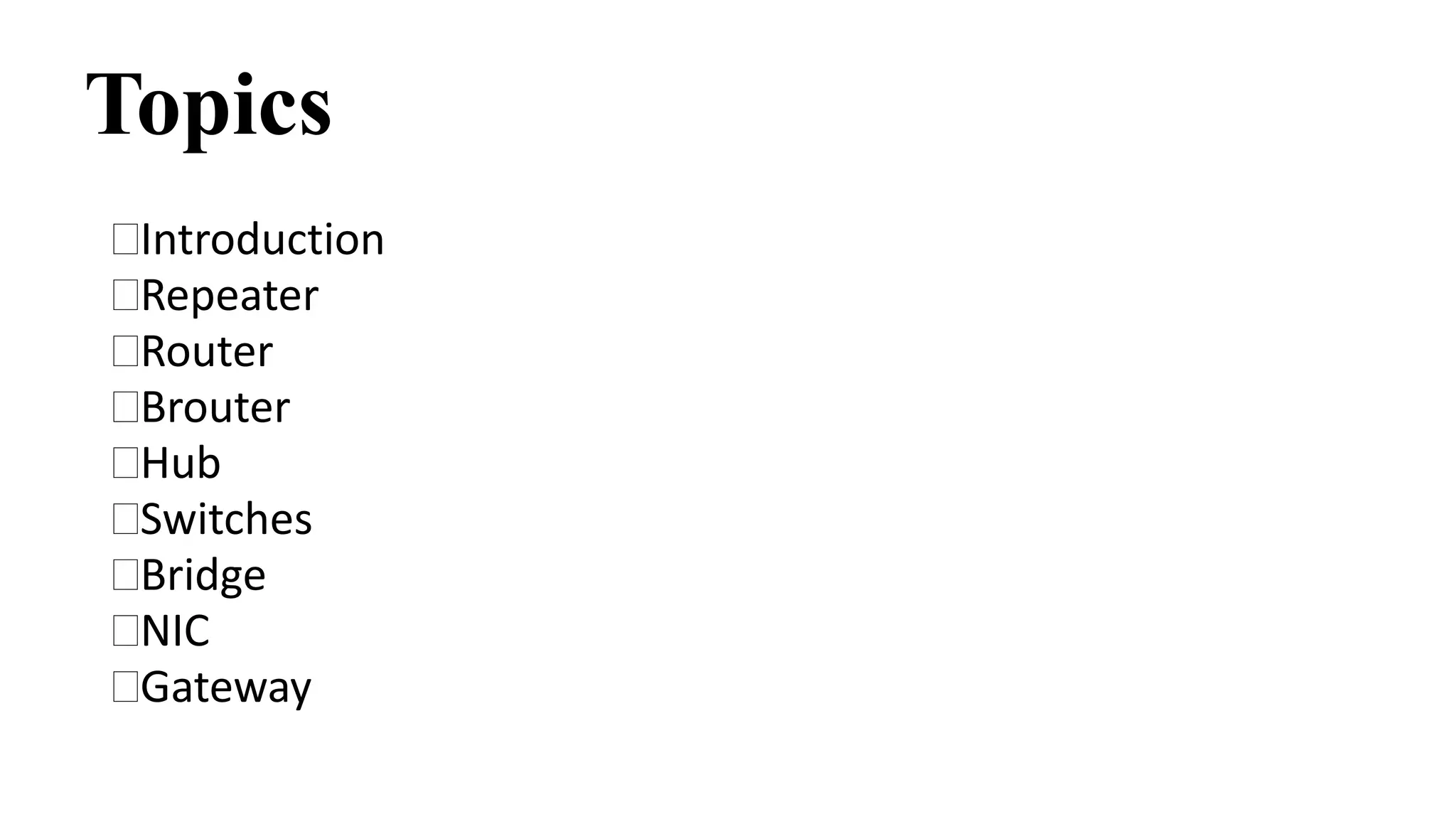 This document discusses various network devices and their functions. It describes repeaters, routers, brouters, hubs, switches, bridges, network interface cards (NICs), and gateways. Repeaters operate at the physical layer and regenerate signals to extend network distance. Routers operate at multiple layers and direct traffic between networks by maintaining routing tables. Bridges separate networks into segments to reduce congestion. Switches operate at the data link layer to limit collision domains. NICs connect devices to the network. Gateways connect different network types and protocols.