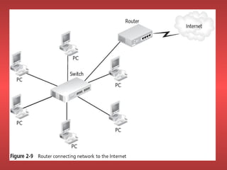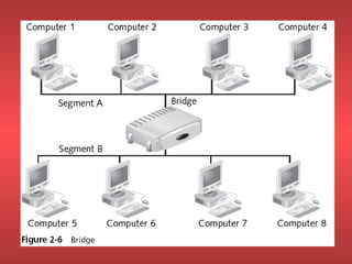 Network devices like repeaters, hubs, bridges, switches and routers are used to extend and segment networks. Repeaters regenerate signals to increase cable length while hubs connect cables without regeneration. Bridges segment networks at the data link layer using MAC addresses. Switches increase performance by opening virtual circuits between devices. Routers connect multiple networks at the network layer using IP addresses and dynamic routing.