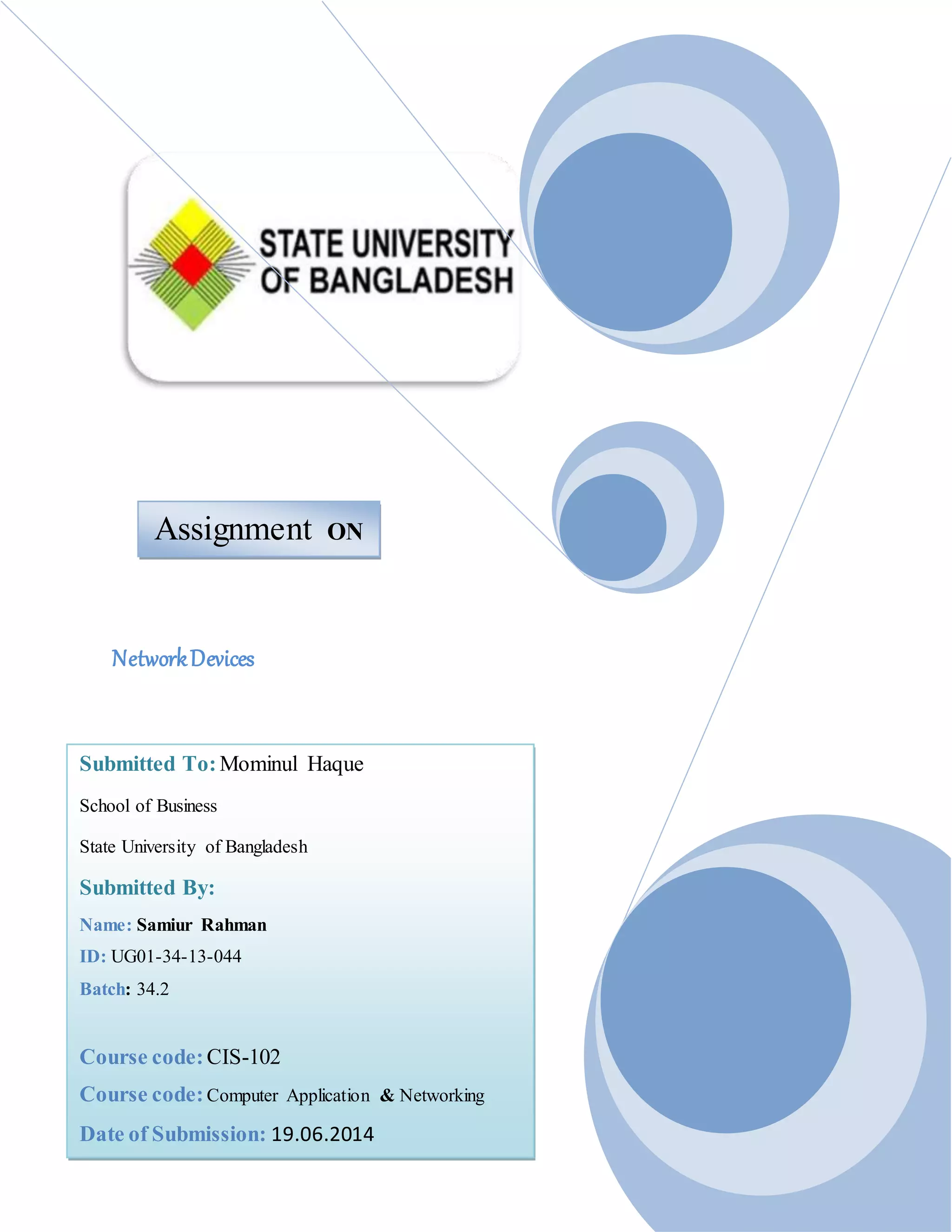The document presents an assignment on network devices, detailing their types including network cards, cables, topologies, and connectivity devices. It explains the functions of each device category and the various topologies like bus, star, ring, and mesh that define network structure. The conclusion emphasizes the significance of computer networks in modern society and the ongoing evolution of networking technology.