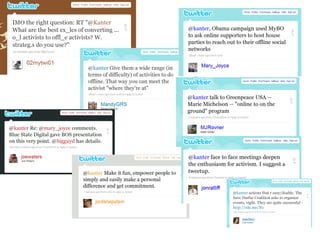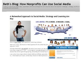 The document discusses using social media to enhance network effectiveness. It defines social media and outlines how it has grown significantly. It then discusses several key aspects to consider when using social media for a network, including understanding the network's objectives, audience, integrating social media with existing strategies, addressing potential cultural challenges, building capacity, choosing appropriate tools and tactics, measuring results, and experimenting with an iterative process.