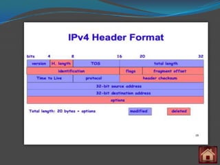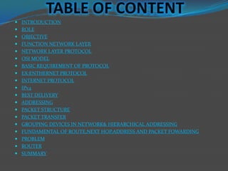 The document discusses the network layer of the OSI model. It describes the network layer's role in dividing networks into groups, facilitating communication between networks via routing. Key aspects covered include network layer protocols like IP, addressing, packet structure, grouping devices into networks via hierarchical addressing, and the fundamentals of routing tables, next hop addresses, and packet forwarding.