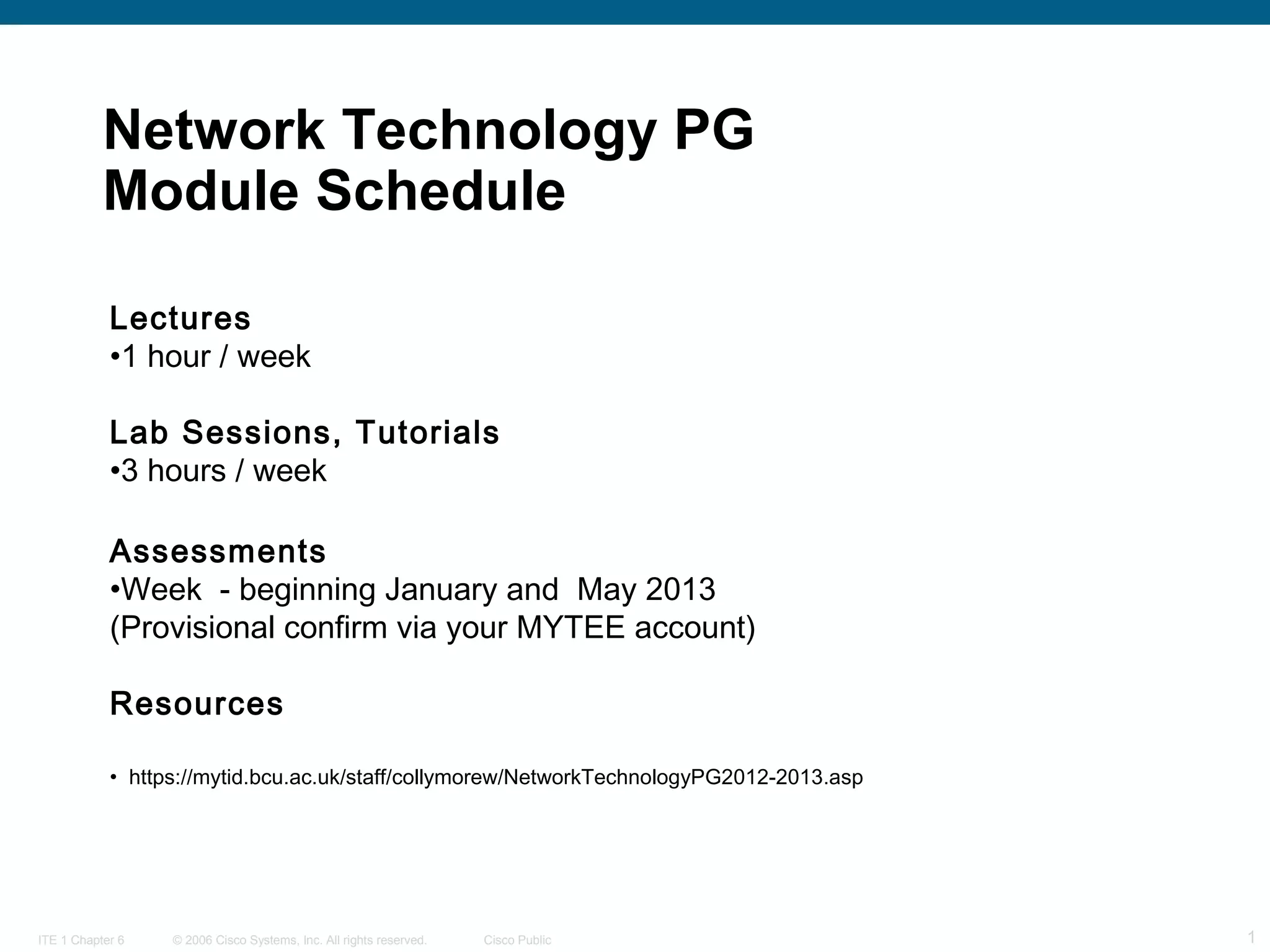 The document outlines the schedule and resources for a Network Technology postgraduate module. It includes 1 hour of lectures and 3 hours of lab sessions/tutorials per week. Assessments are scheduled for January and May 2013, and students can confirm dates via the university account. Additional resources are available at a provided web link. The module objectives are to understand how networks impact daily life, identify network components, opportunities/challenges of converged networks, and characteristics of network architectures like fault tolerance, scalability, quality of service and security.