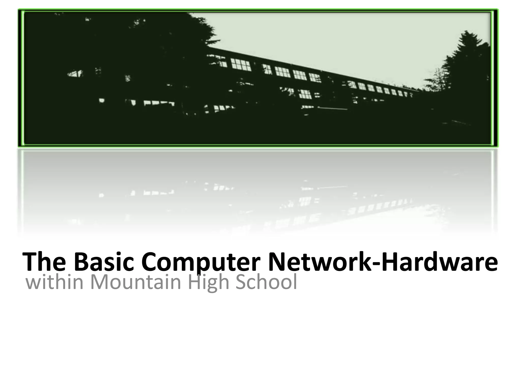 Mountain High School has around 800 students and 45 staff members. It aims to utilize technology to improve engagement. Its computer network includes a local area network connecting all classrooms and facilities on campus through Ethernet cables. This LAN is connected to the district's wide area network and the Internet through the school's router and connection to an Internet service provider. Key hardware includes network interface cards, Ethernet jacks, cables, switches, and a router. The network allows students and staff to access the Internet, library resources, and printers. Some rooms also have wireless connectivity for certain devices.