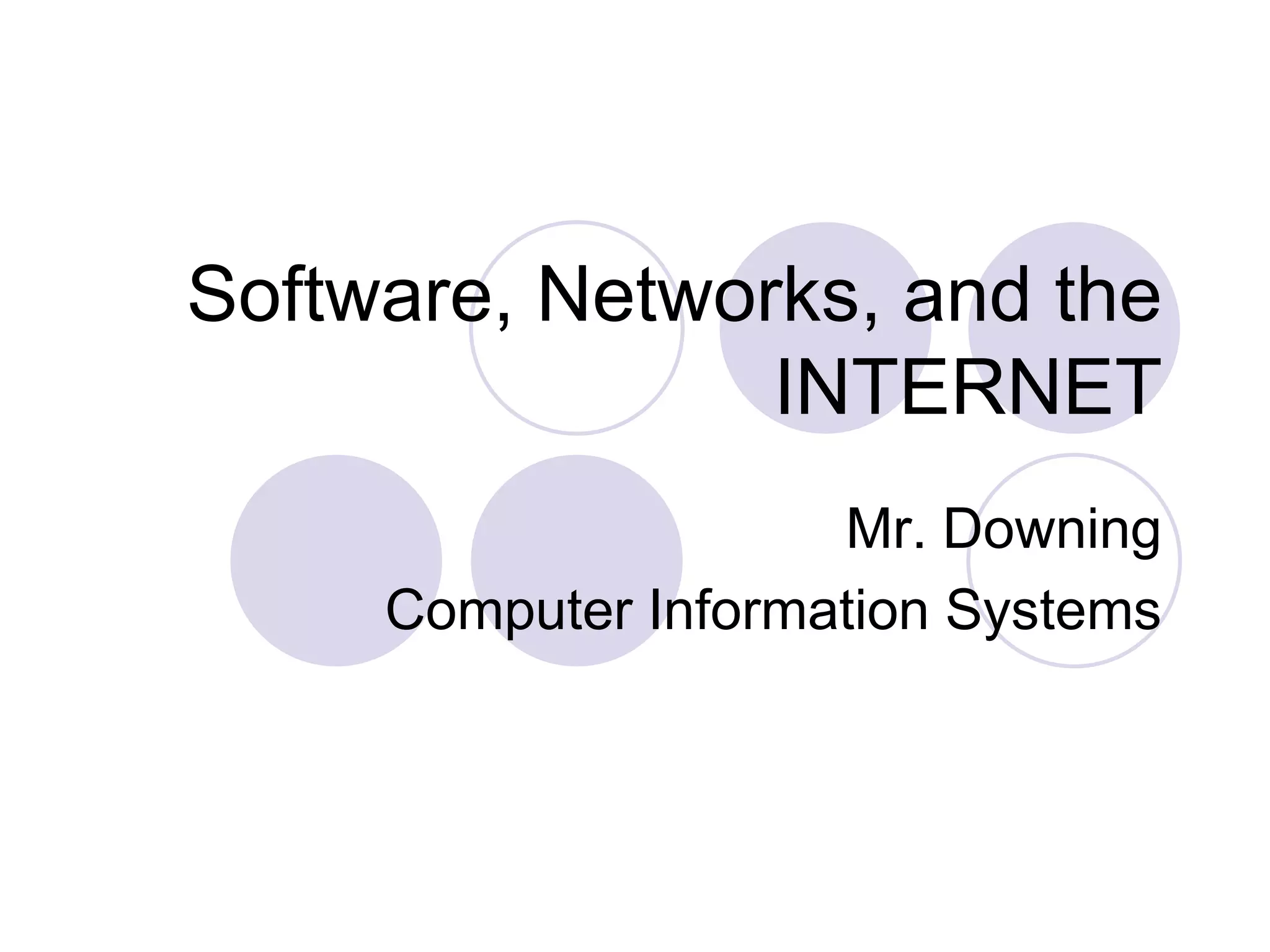 This document discusses computer software, networks, and the internet. It covers system software like operating systems, application software like word processors and spreadsheets. It defines networks as collections of connected computers and devices, describing local and wide area networks. Key network terms are defined, including servers, network interface cards, firewalls, and routers. The internet is identified as the world's largest network, with discussion of the world wide web, URLs, and how individuals and businesses use the internet for entertainment, communication, research, e-commerce, and more.