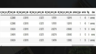 This document outlines a machine learning project on network intrusion detection. It presents the objectives, which are to detect network intrusions using supervised machine learning algorithms like Naive Bayes, Decision Tree, K-Neighbors and Logistic Regression. The best performing model was found to be Decision Tree classification, which achieved 99.60% accuracy on the test data. The document discusses the system model, problem statement, data collection and preprocessing steps, model training and evaluation, and concludes with possibilities for future work such as using different datasets and deep learning approaches.