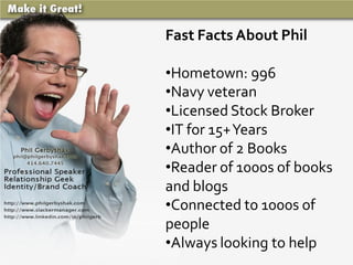 Phil Gerbyshak is a seasoned professional with over 15 years in IT, a navy veteran, and a licensed stock broker. He has authored two books and claims to have read thousands of books and blogs while connecting with countless individuals, always eager to assist others. His approach emphasizes personal engagement, sharing knowledge, and fostering mutual support.