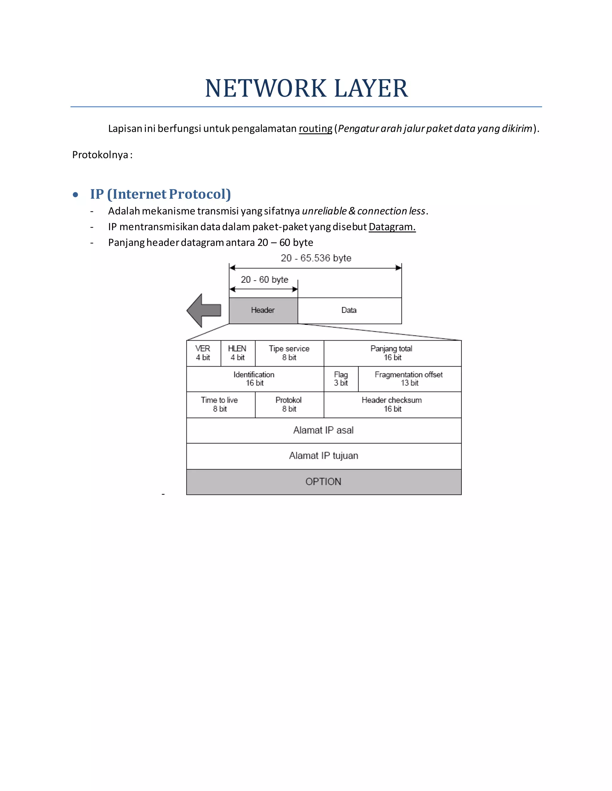 Lapisan jaringan bertanggung jawab untuk pengalamatan, routing paket data, dan protokol terkait seperti IP, ARP, RARP, ICMP, PING, TRACERT, dan IGMP. IP menggunakan datagram untuk mentransmisikan data secara tidak terhubung, sementara ARP dan RARP melakukan peta alamat antara alamat fisik dan IP. ICMP berisi pesan kendali dan kesalahan, sementara PING dan TRACERT digunakan untuk menguji konektivitas dan me