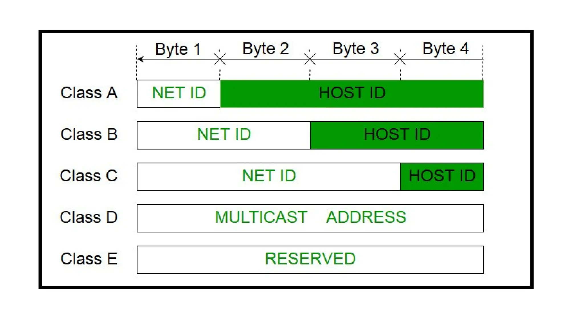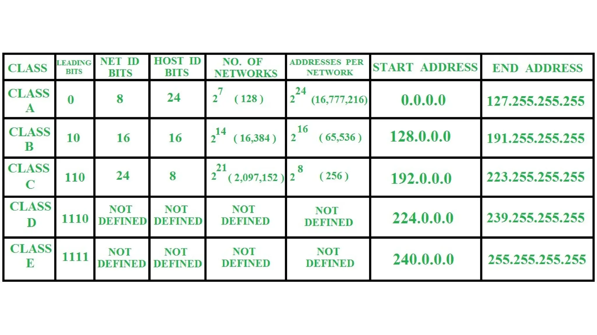 class D ranges from 224.0.0.0 – 239.255.255.255.