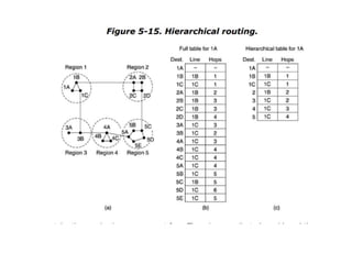 The network layer is responsible for end-to-end packet transmission across multiple hops between source and destination machines. It uses routing algorithms to decide the optimal path for packet forwarding. Common routing algorithms include distance vector routing where each router shares its routing table with neighbors, and link state routing where each router floods information about connected links to other routers which then compute the shortest paths. Hierarchical routing reduces routing table sizes by grouping routers into regions. Broadcast and multicast routing are used to transmit packets from one source to multiple destinations.