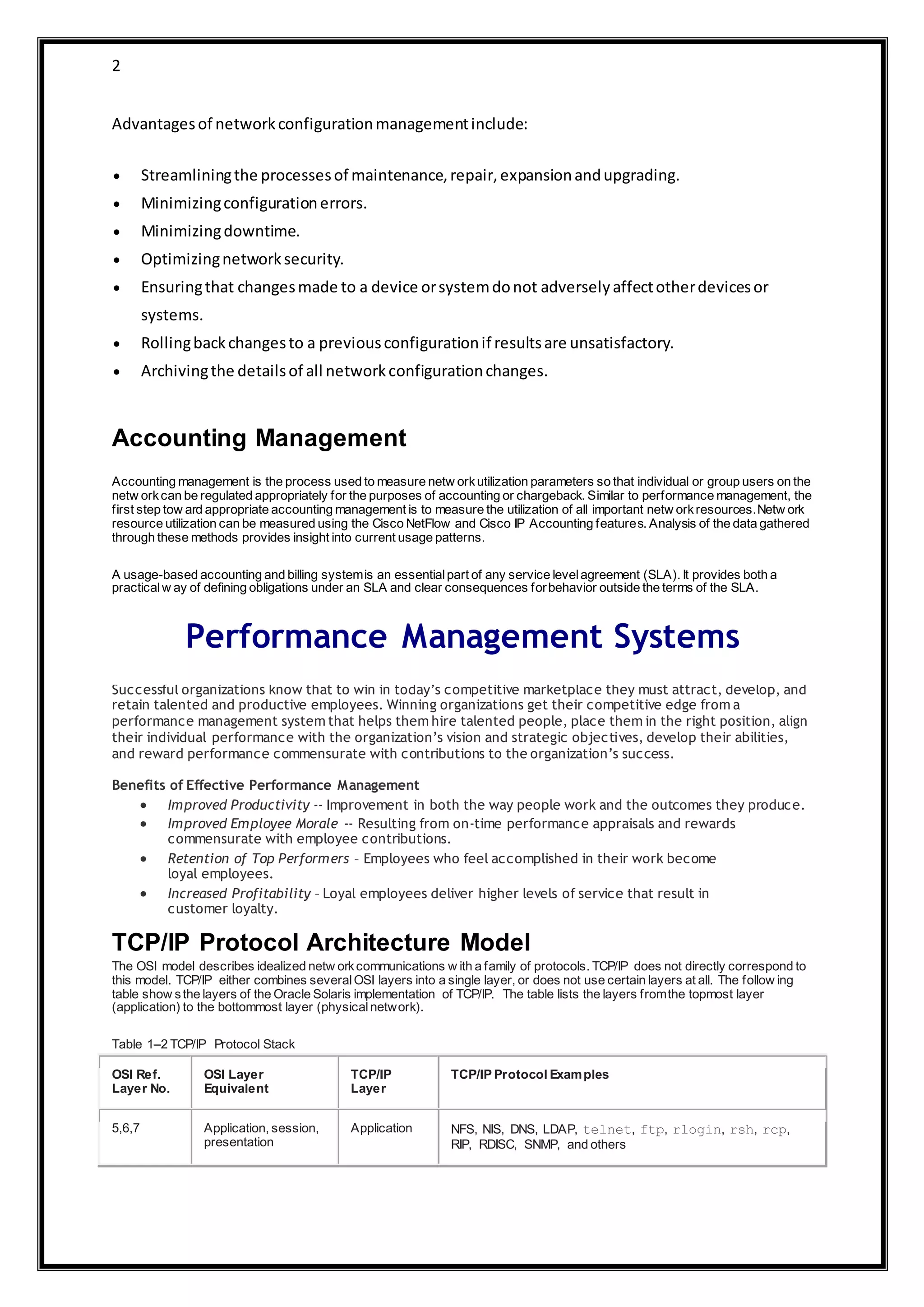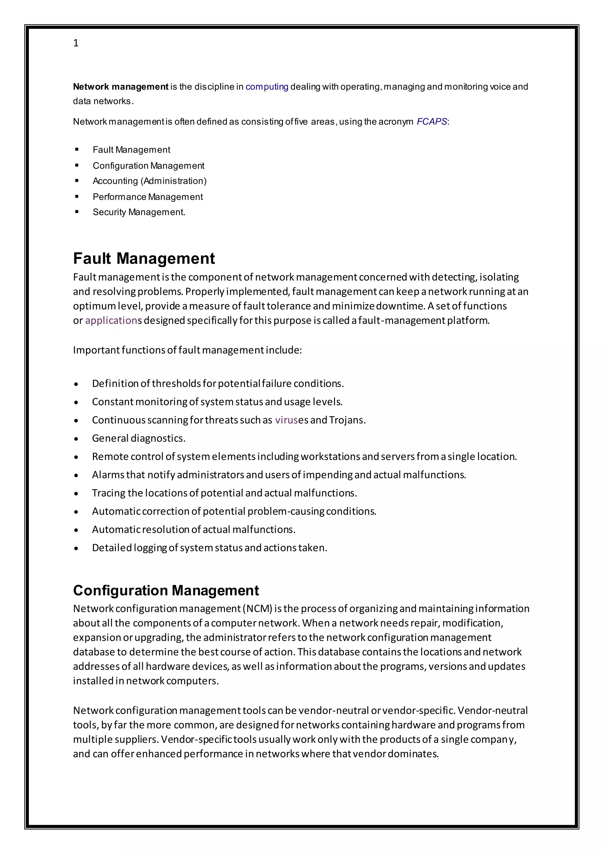 Network management involves operating, managing, and monitoring voice and data networks. It consists of five key areas: fault management, configuration management, accounting, performance management, and security management. Fault management detects, isolates, and resolves problems to minimize downtime. Configuration management involves organizing and maintaining information about all network components in a database. This helps with maintenance, repair, expansion, and upgrades. Performance management measures network utilization for accounting and regulating user access appropriately.