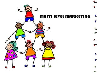 Multi-level marketing (MLM) involves multiple levels of salespeople who recruit others and receive commissions from their sales and the sales of those they recruit. In an MLM company, sales representatives recruit others rather than just making their own sales. This allows for rapid expansion as more sales representatives are trained. It also allows sales representatives to earn commissions not just from their own sales but from the sales of those they recruit. While MLM can provide benefits like continuous expansion and low overhead costs, it also faces criticisms like inability to fulfill promises to most participants and potential exploitation of personal relationships.