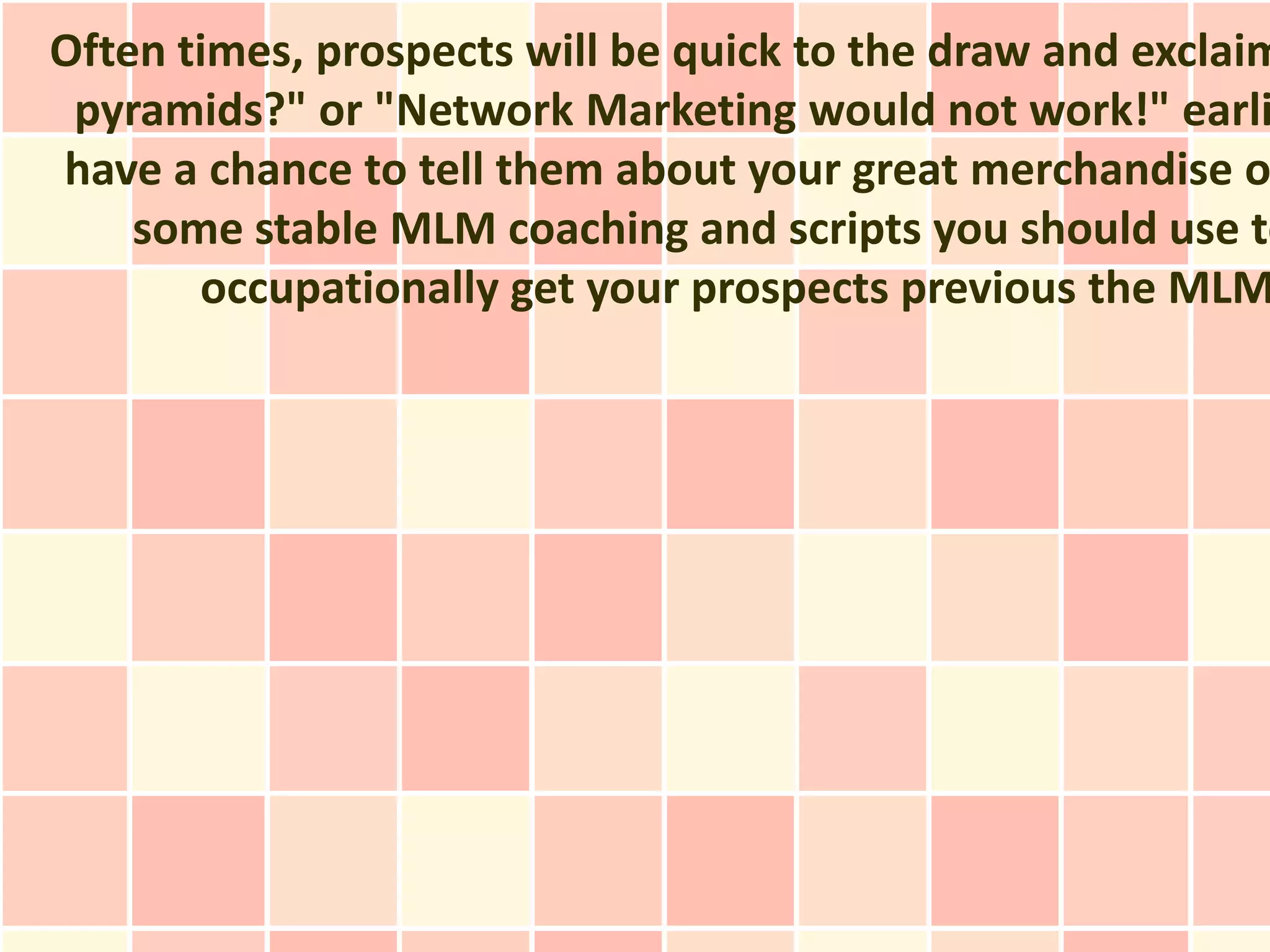 This document provides coaching and scripts for network marketers to address common objections from prospects, such as concerns that multi-level marketing is a pyramid scheme. It recommends acknowledging the prospect's perspective, asking about their past experiences, and guiding them to understand that inadequate training, not the business model itself, was the reason for any lack of success. The document presents word-for-word responses to objections that position proper training as the key to success and differentiate the opportunity being presented from the prospect's past experiences. It advises referring prospects to an independent video about network marketing and closing by inviting them to learn more.