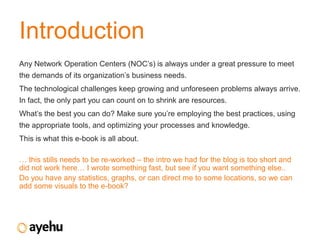 This document discusses best practices for Network Operations Centers (NOCs). It covers essential tools like ticketing systems, knowledgebases, reporting and monitoring. Implementing these tools helps NOCs keep track of issues, share knowledge, measure performance, and monitor infrastructure and user experience. The document also discusses defining roles and responsibilities clearly to avoid delays in decision making and assigning work appropriately based on skills. Defining operator and shift manager roles helps prioritize tasks and escalate issues effectively.
