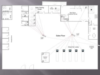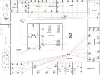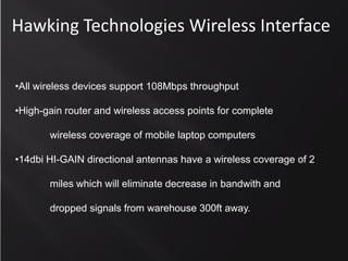 The network provides 100Mbps bandwidth with the ability to upgrade to 1000Mbps. Wireless access is provided via 802.11g. Three servers provide Active Directory, file sharing, intranet, email, and more. Switches support 10/100/1000Mbps Ethernet with fiber optic and wireless connectivity. Wireless devices support 108Mbps throughput with high-gain antennas providing coverage up to 2 miles. Dell servers run Windows Server 2003 and include a file/web server with RAID5 storage. Workstations have Core 2 Duo CPUs and run Windows Vista with Office 2003. Point of sale terminals have Celeron CPUs and run Windows with barcode scanners. Installation will take 10 days to set up wiring and systems
