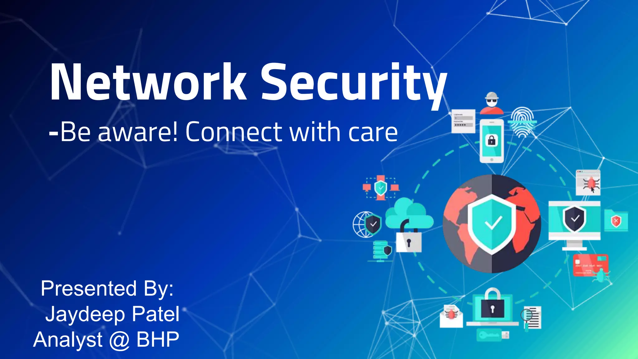 This document discusses network security and outlines common threats and countermeasures. It begins by defining security as freedom from harm caused by others. It then outlines organizations that are vulnerable to network attacks, such as financial institutions, governments, and corporations. Common attacks are discussed like denial of service attacks, software exploits, packet sniffing, and social engineering. Countermeasures recommended include antivirus software, firewalls, intrusion detection systems, virtual private networks, and network access control to monitor devices and users on the network. The document emphasizes the importance of staying aware of security updates to patch vulnerabilities.