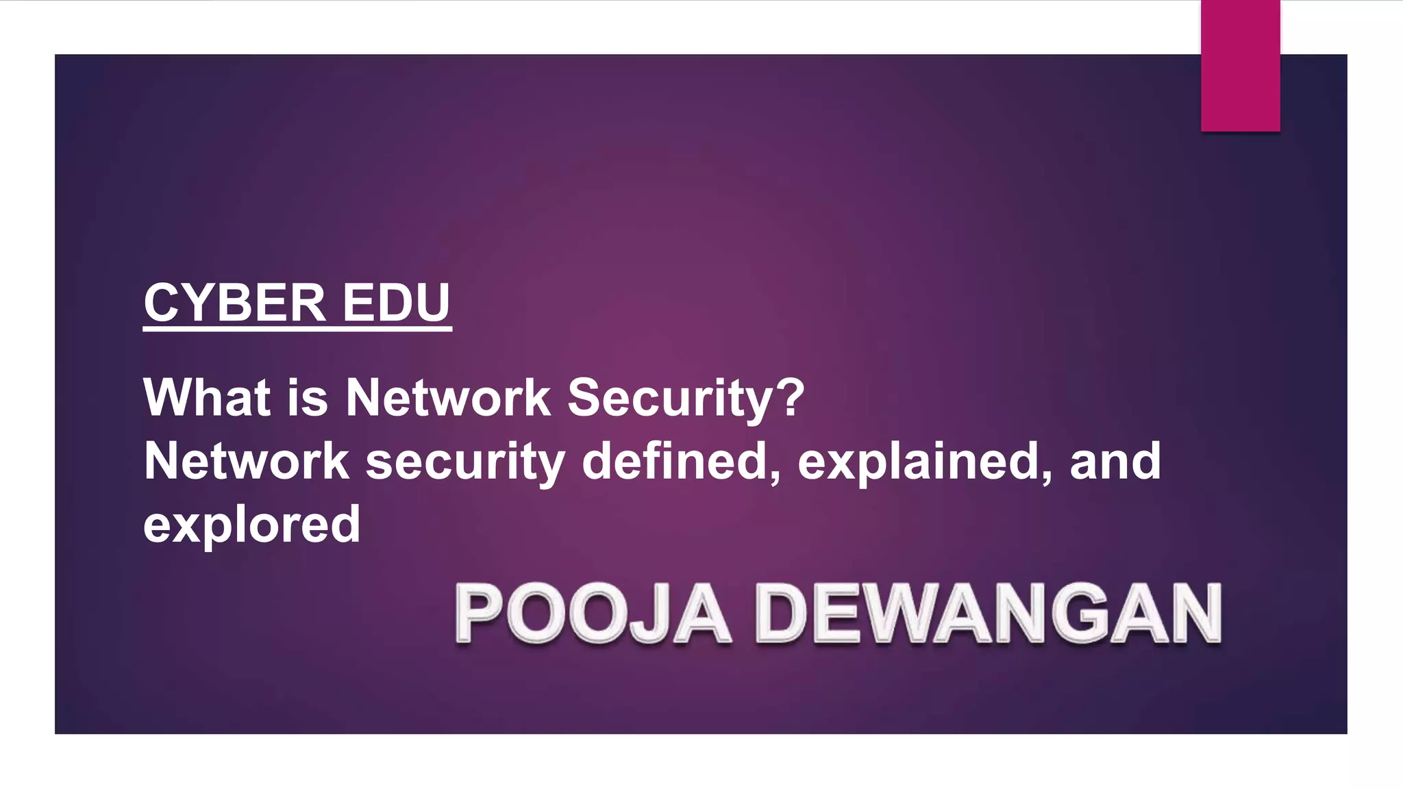 Network security refers to the set of rules, technologies, and processes used to protect computer networks. It aims to preserve the confidentiality, integrity, and availability of network data and resources. Network security works through physical, technical, and administrative controls. Physical controls restrict access to network infrastructure. Technical controls protect data in transit and storage through measures like antivirus software, firewalls, and virtual private networks. Administrative controls govern user authentication, access levels, and system changes through security policies. Together these layers safeguard networks from both internal and external cyber threats.