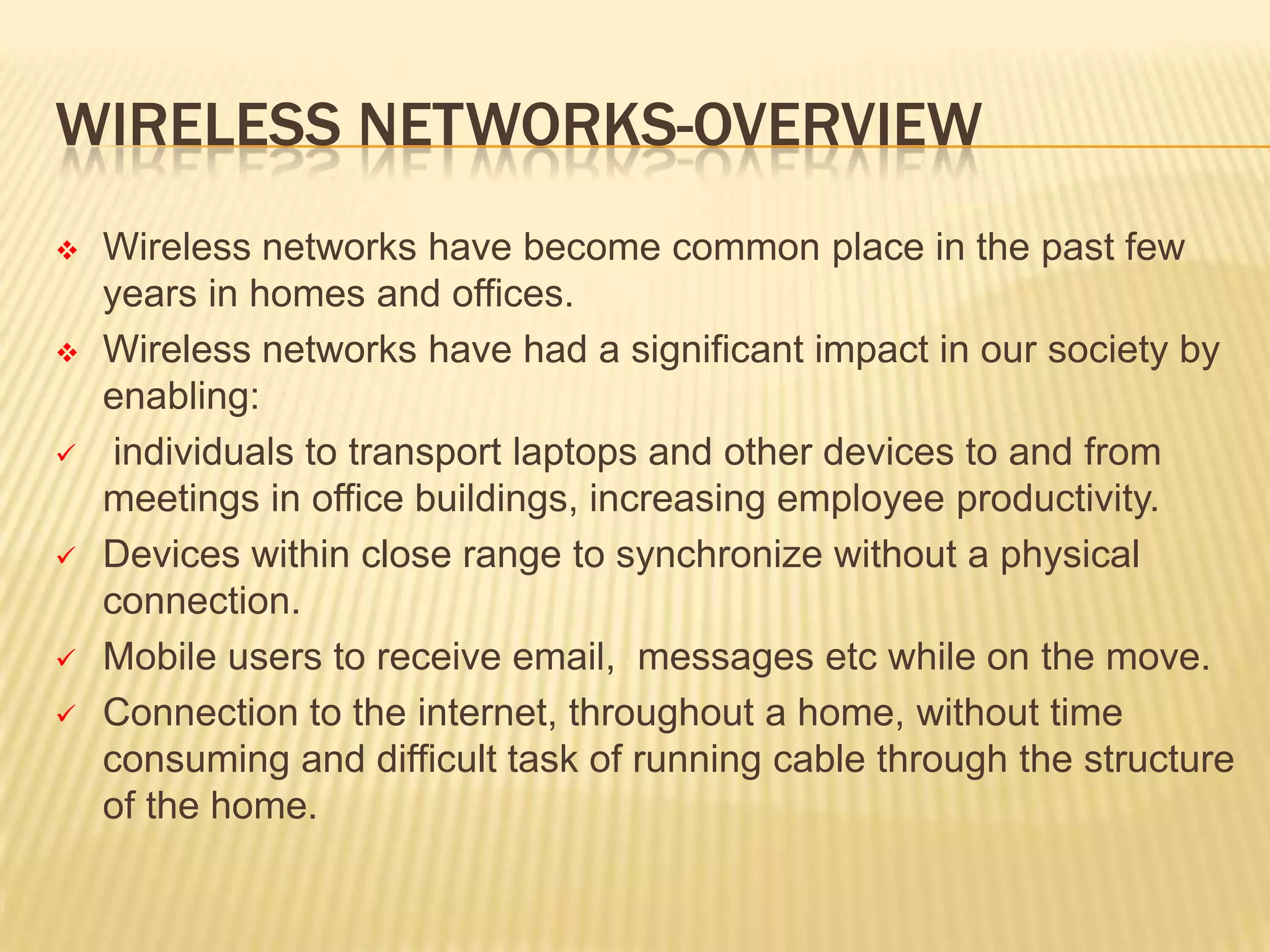 Wireless networks have become commonplace in homes and offices, enabling increased productivity and mobile connectivity. They function by connecting clients to a central access point or in an ad-hoc peer-to-peer mode. Early security standards like WEP had vulnerabilities due to short encryption keys and initialization vector reuse. WPA and its successor WPA2 were developed to address these issues through stronger encryption, authentication, and dynamic key generation. However, wireless networks remain vulnerable to insertion attacks by unauthorized clients or rogue access points, as well as traffic interception if encryption is not used.