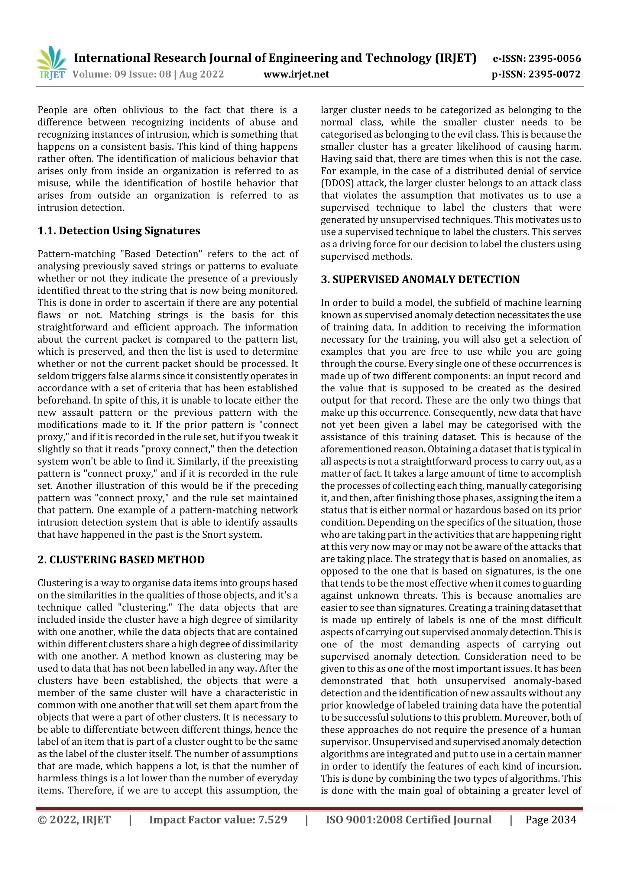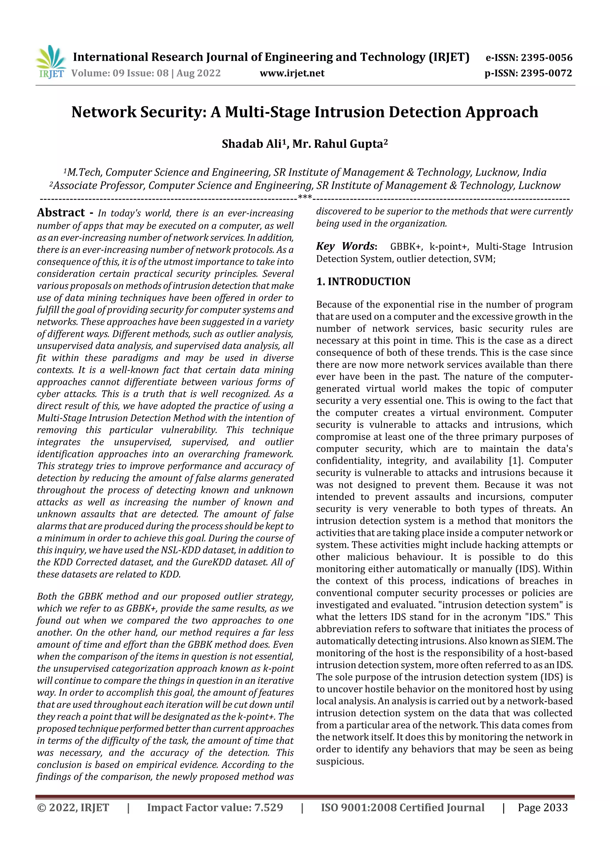 This document discusses a multi-stage intrusion detection approach that integrates unsupervised, supervised, and outlier detection methods. It evaluates the proposed approach on several datasets and finds it performs better than current methods in terms of accuracy and detection of known and unknown attacks while reducing false alarms. Specifically, it combines unsupervised clustering, supervised anomaly detection using support vector machines (SVM), and outlier analysis using the k-point+ and GBBK+ methods in a staged framework. Simulations show the approach effectively manages outliers and missing data. A complexity analysis finds the proposed method and prior approaches have the same asymptotic complexity but the new method provides better results for large datasets. Performance analysis using SVM on datasets both with and without outliers identified by the